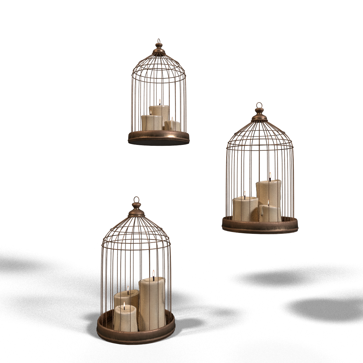 Set of 3 floating cages with candles, animated to slowly rotate in the sky. Adjust animation speed and light strength to your linking.