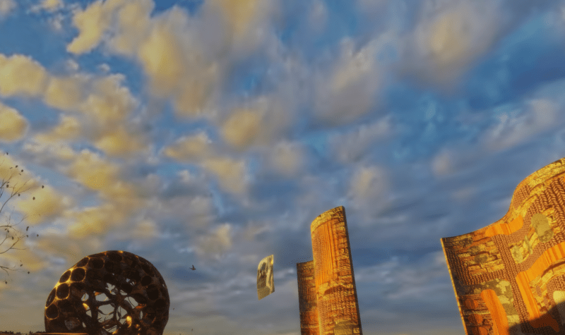 A brilliant, stunning white Scandinavian sun emerges on the horizon, setting the scudding clouds ablaze with a brilliant yellow-gold, against a blue morning sky. Impossibly cheerful, optimistic and promising sky!