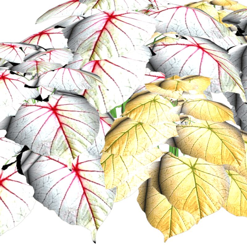 This is 6 little groups of caladiums mixed together to give a natural look as 2 different caladium plants grown together. Polygon count: 7656. There is no collision on this so you can walk through it. I have many colors. To see this flower in Atlas, please visit "LovedWarrior's Ground Plants." Please note that all my flowers are 100% detailed mesh meaning no flat planes with flower pictures pasted on them. Each petal, pollen, stalk and leaf is made by hand and placed by hand. All the textures are also made by me. If you have requests, show me a picture of a flower and I will tell you if I can make it for you. Enjoy!