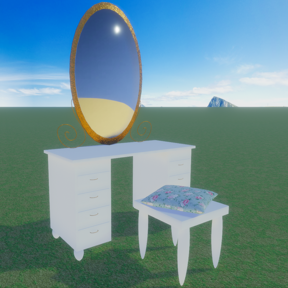A cool vanity desk with mirror, stool and pillow. Has maps, collision and even sit points! Vanity decor for it coming soon.