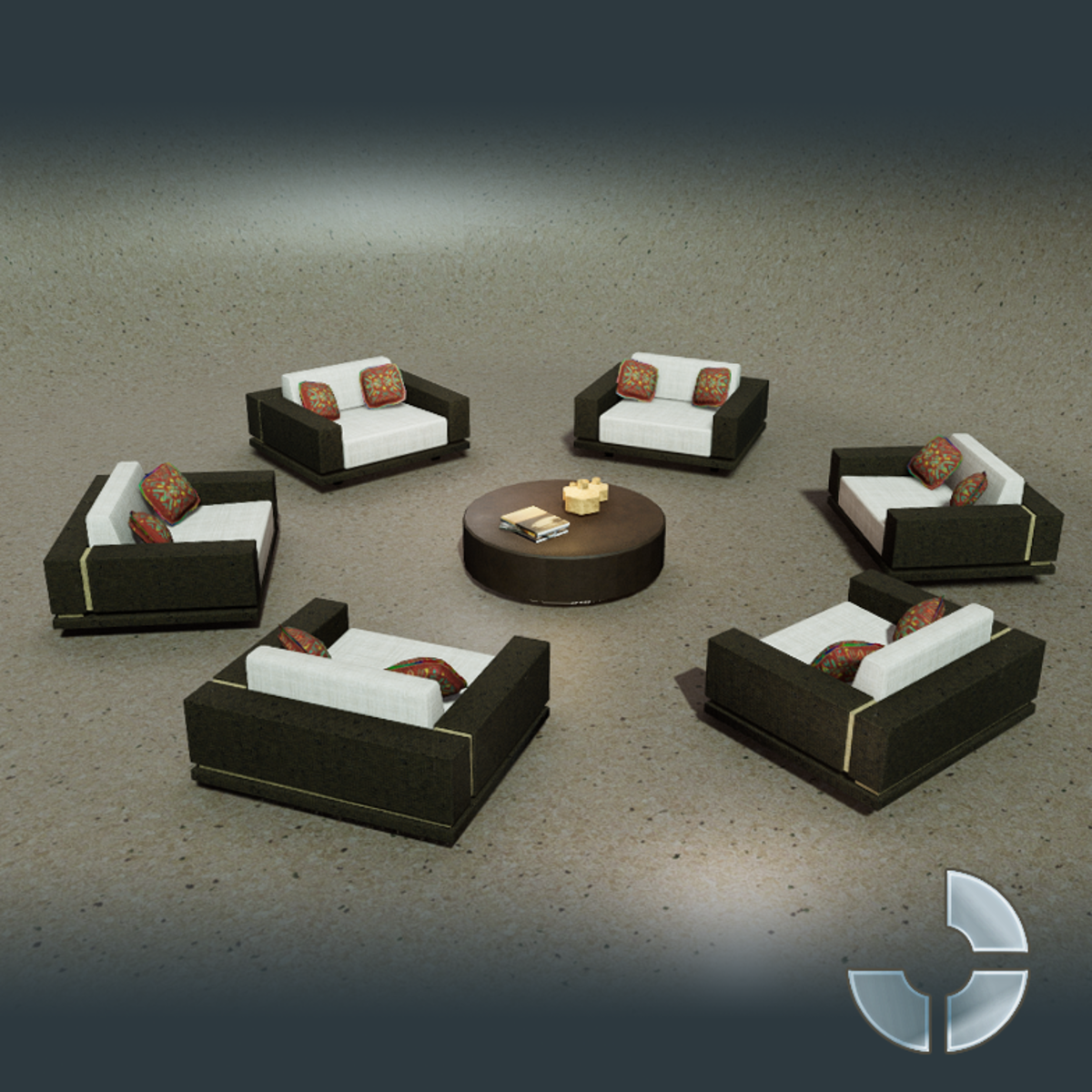 Set of 6 modern outdoors armchairs with a decorated coffee table. Content of the Bundle: - 6 Rustic straw armchairs . 1.5 K Polygons each one- PBR Textures - 1 Coffeetable. 306 Poligons each one - 12 Cushions. 416 Poligons each one - 4 Books. 84 Poligons each one - 3 Jars. 60 poligons each one.