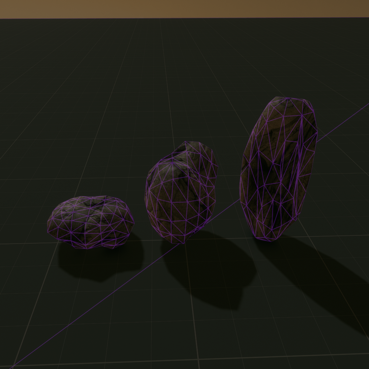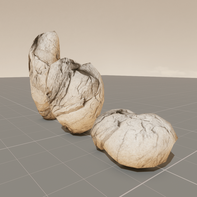 Set of 3 rocks with dimples. PBR materials. Collision. Editable. Unwrapped for easy custom retexture. 16 MB, 230-192-192 tris.