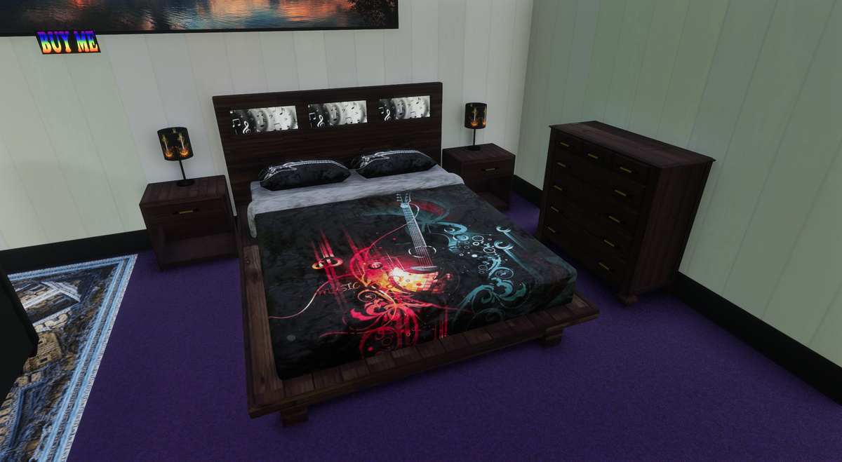 Luxurious platform bed for 2 with matching night stands and dresser. Never used and already made. All set to "Rock N Roll" with high quality sheets, music themed comforter, pillow cases and lamps. Enjoy your stay anywhere with this very soft but firm mattress gently placed on the wonderful platform made from perfectly picked reclaimed wood from an old abandoned town in some other country but this one.
