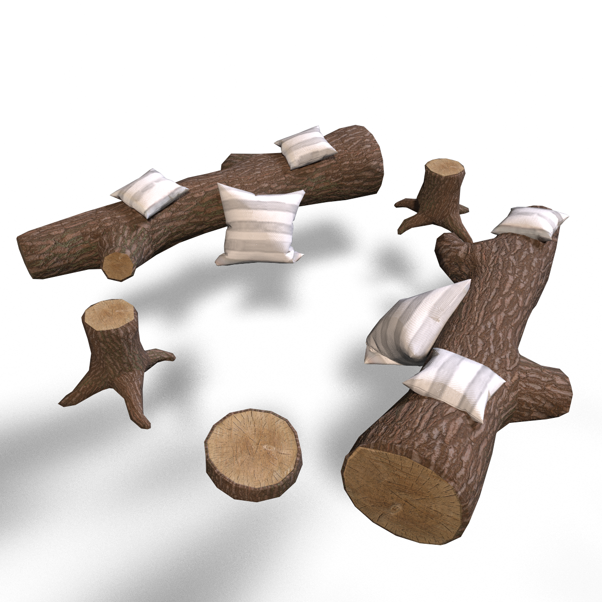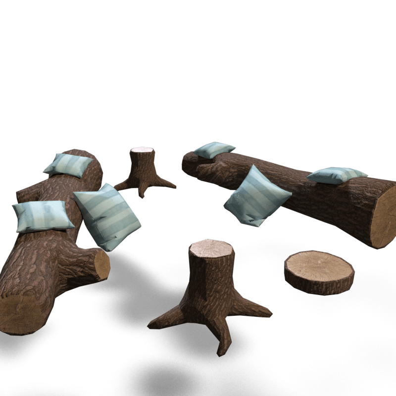 Cozy Campfire Seating Included is everything you see on the picture Trunks both have 2 sit-points in the small pillows on top The tree stumps have 1 sitpoint The tree trunk slice does not have a sitpoint The slice can be used to sit on with your own sit emote and as a pathway to the seating area, just copy and rotate for a more natural look of the pathway The pillows are by default in white-gray, if you fancy another color, just adjust that in the materials. Find a cozy fire Here: https://store.sansar.com/listings/c148f868-51fe-4085-b7c4-3d36642b0093/cozy-campfire
