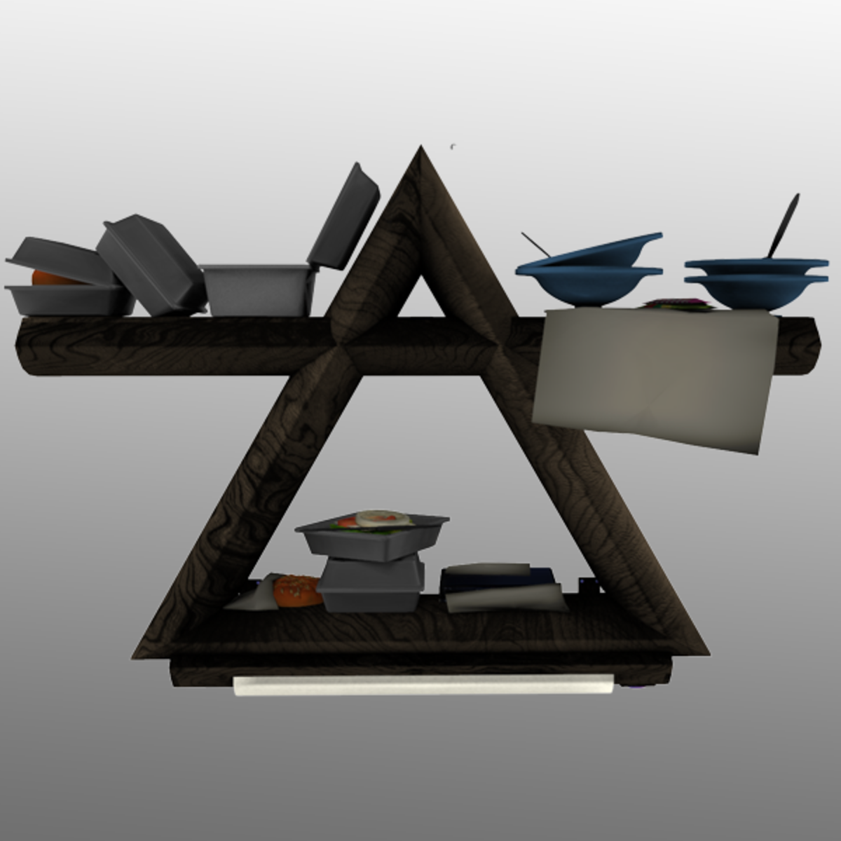 Decorations for the elemental journey. This wooden shelf was designed after the air symbol. Put in your meditative interactive space. Its glowing lamps will bring enlightenment in the night, and passive wealth in the day.
