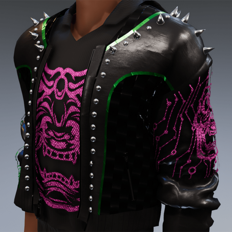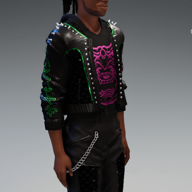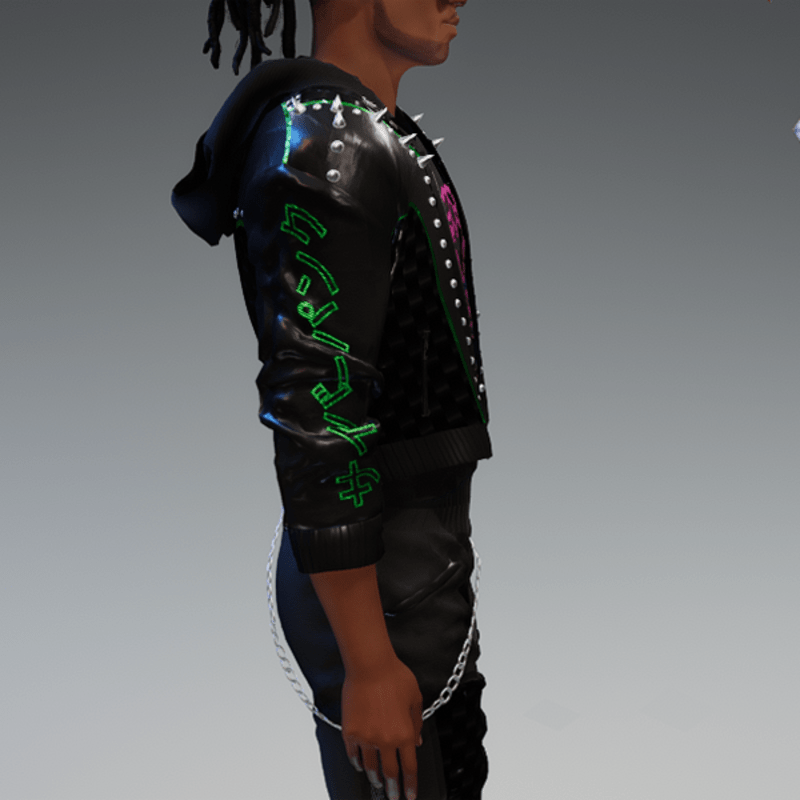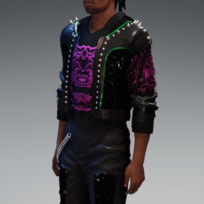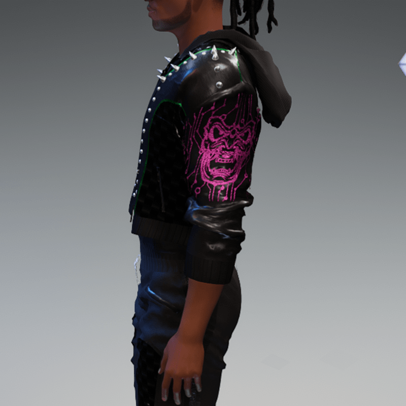 this leather jacket is inspired by the awesome "cyberpunk" game. It comes with a samurai print on the front and on one side as well as the word "cyber punk" in japanese on the other side and some rivets. Enjoy <3