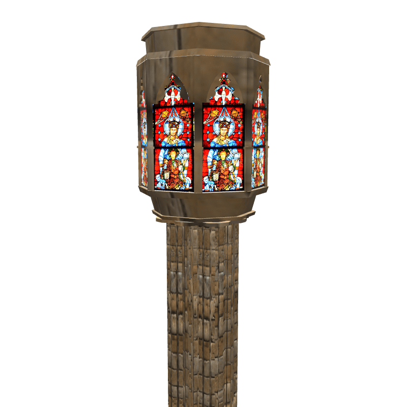Cathedral pillar set with built-in emissive stained glass gothic lamps. One version includes leafy vines. Both have built-in lights, adjust if needed.. textures can be changed if needed..resellable.