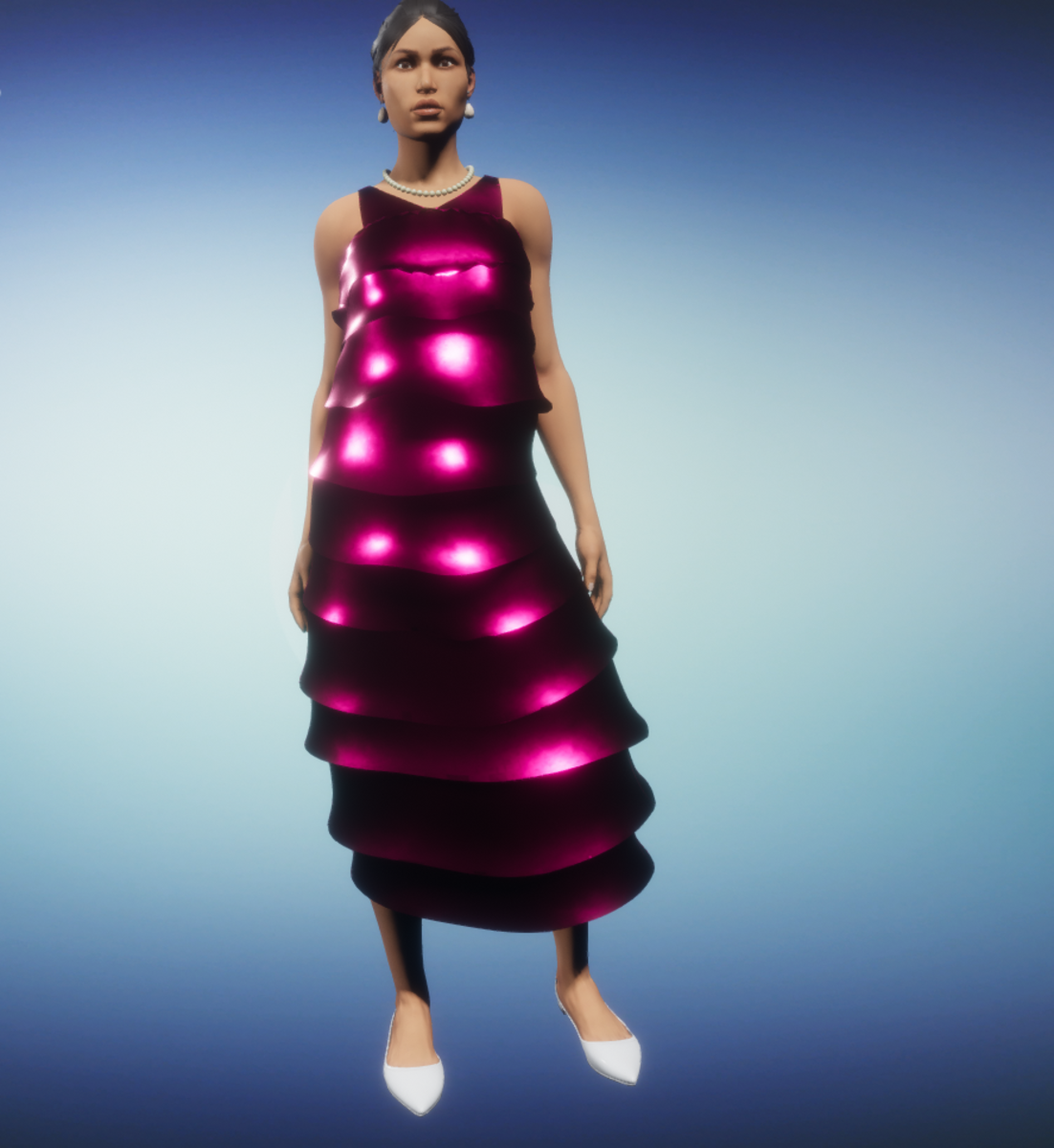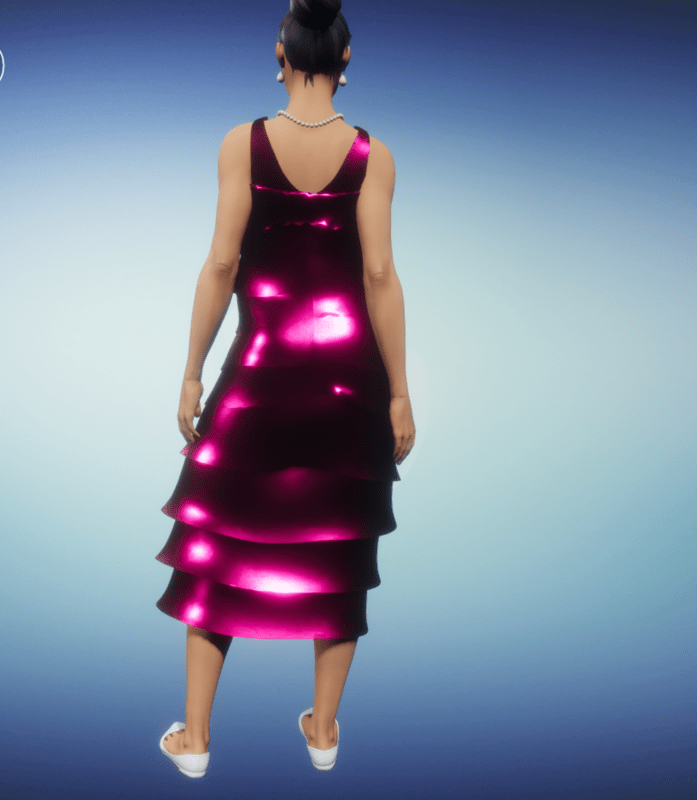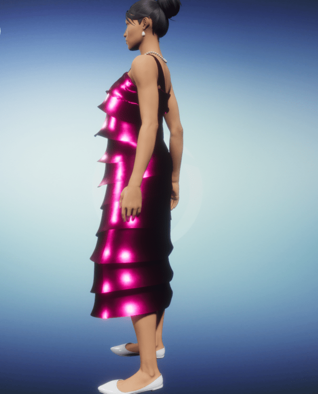Mid-calf length multi-tiered dress in shiny magenta metallic fabric.