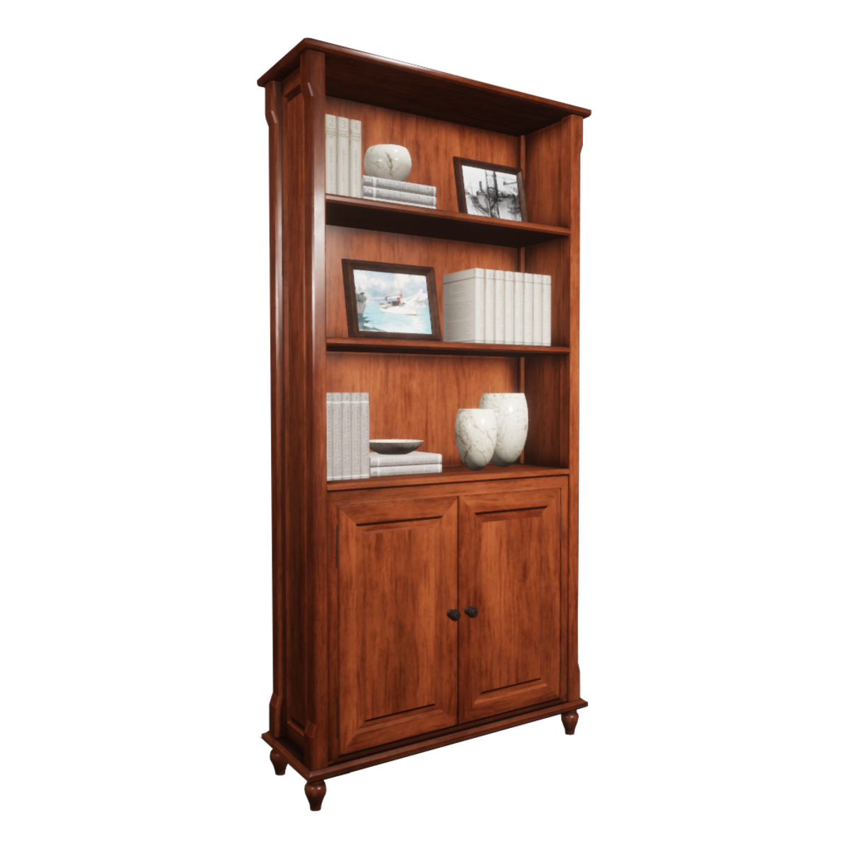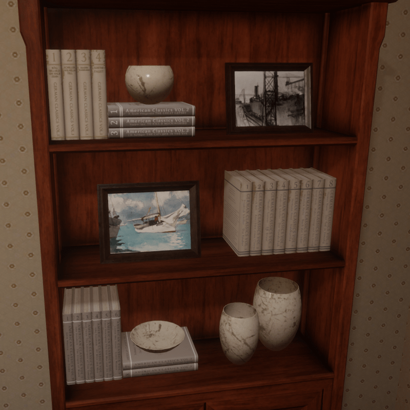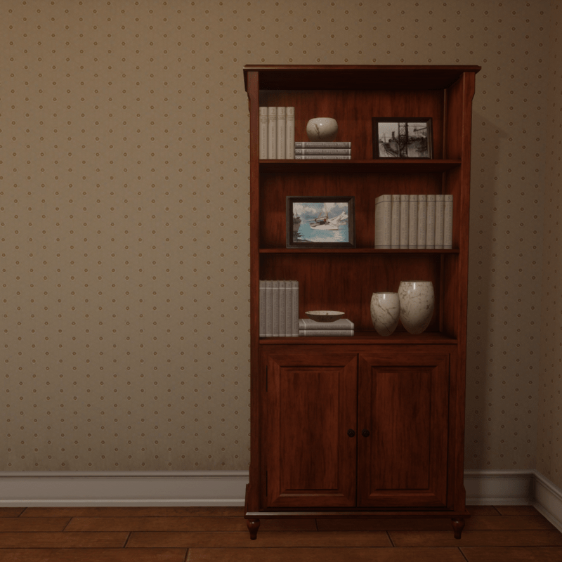 As seen in 114 Harvest experience. High polished wood bookshelf cabinet with books and decorative items. You can check out the bookshelf at the following link https://atlas.sansar.com/experiences/draxtor/114-harvest