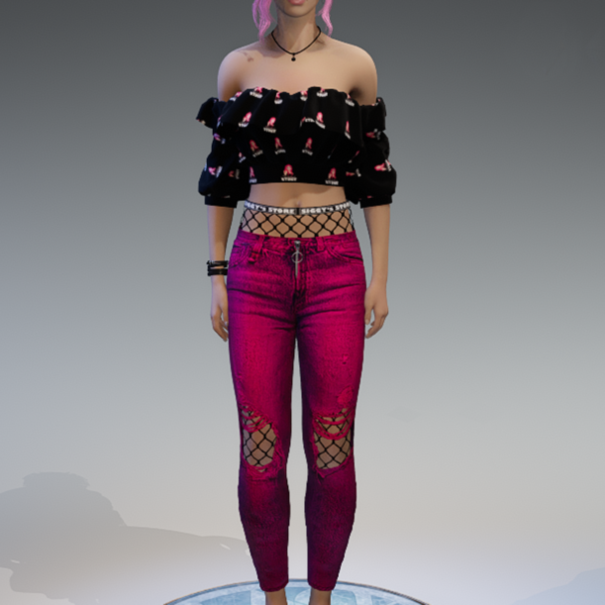 A full outfit, including the denim pants with some fishnet-applications on the knees and the top of the pants, as well as the 'flutter' shoulderfree top! This is the free 'siggys store'-version, so you can use this one if you want to know how this outfit will look like on your avatar before buying one of the other verions. Enjoy!