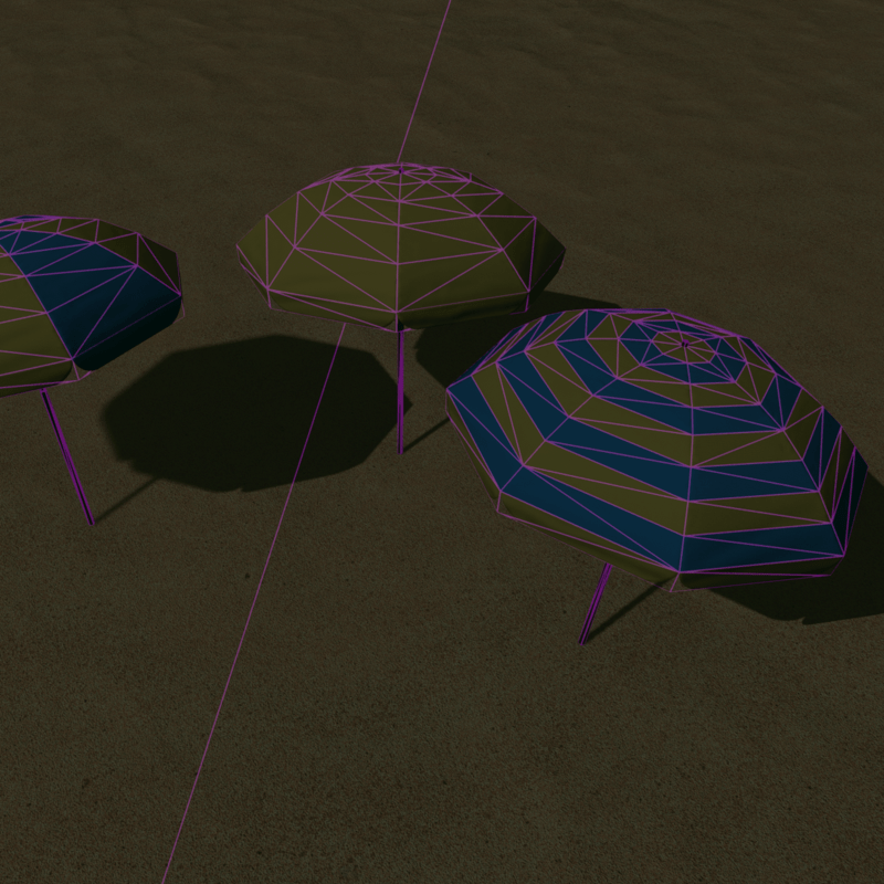 Set of 3 separate umbrellas in different styles included: -plain umbrella 1 color -sectioned umbrella 2 colors -striped umbrella 2 colors each color is tintable with a white base so you can change the colors how you like (see other screenshots) Low poly and low impact mesh has subtle displacment animation to show wind, this setting is adjustable