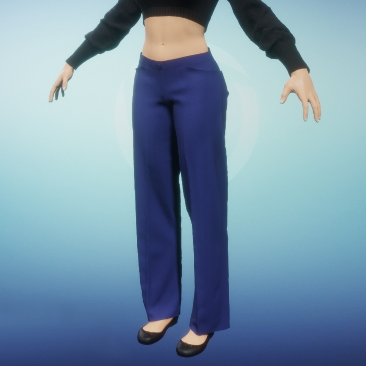 Women's dress slacks with front closure, welt pockets and back patch pockets. Front and back center legs have gently pressed folds for a dressy appearance. Be sure to animate cloth when wearing these slacks. Also, when layering, wear top layers first and then add lower layers. So if wanting to tuck in a shirt, where the shirt first then the slacks. If wanting to wear a top over the slacks wear the top first.