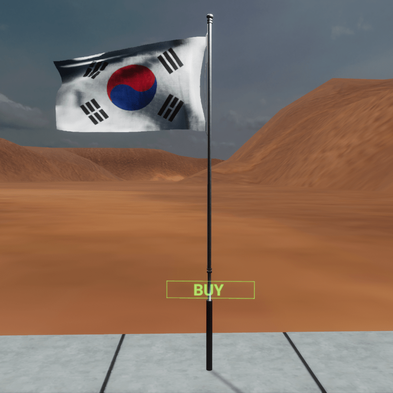 Animated flag of South Korea waving in the wind. It is placed on a 4 meter pole. All permissions enabled except meterial flag. Available to view here: https://atlas.sansar.com/experiences/fernandop/full-experience-in-sales-for-exhibitions-and-events Don't forget to rate the product.