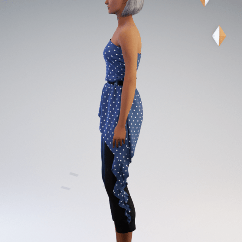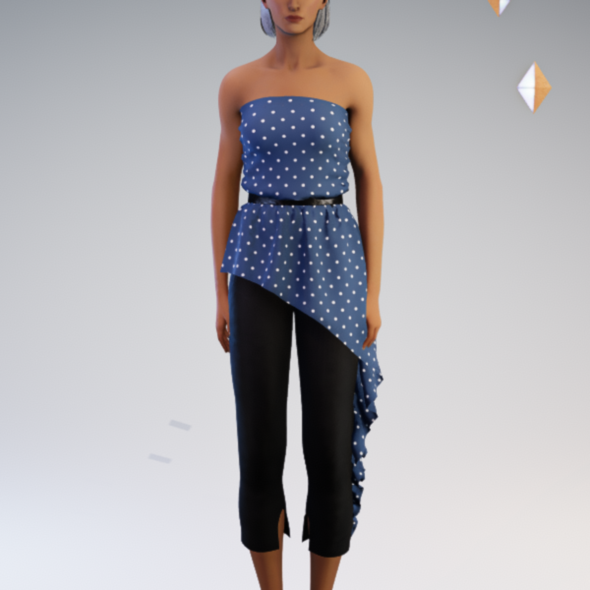 Belted strapless asymmetric blouse and capri pant outfit featuring a polkadot print. by Sweet Distractions