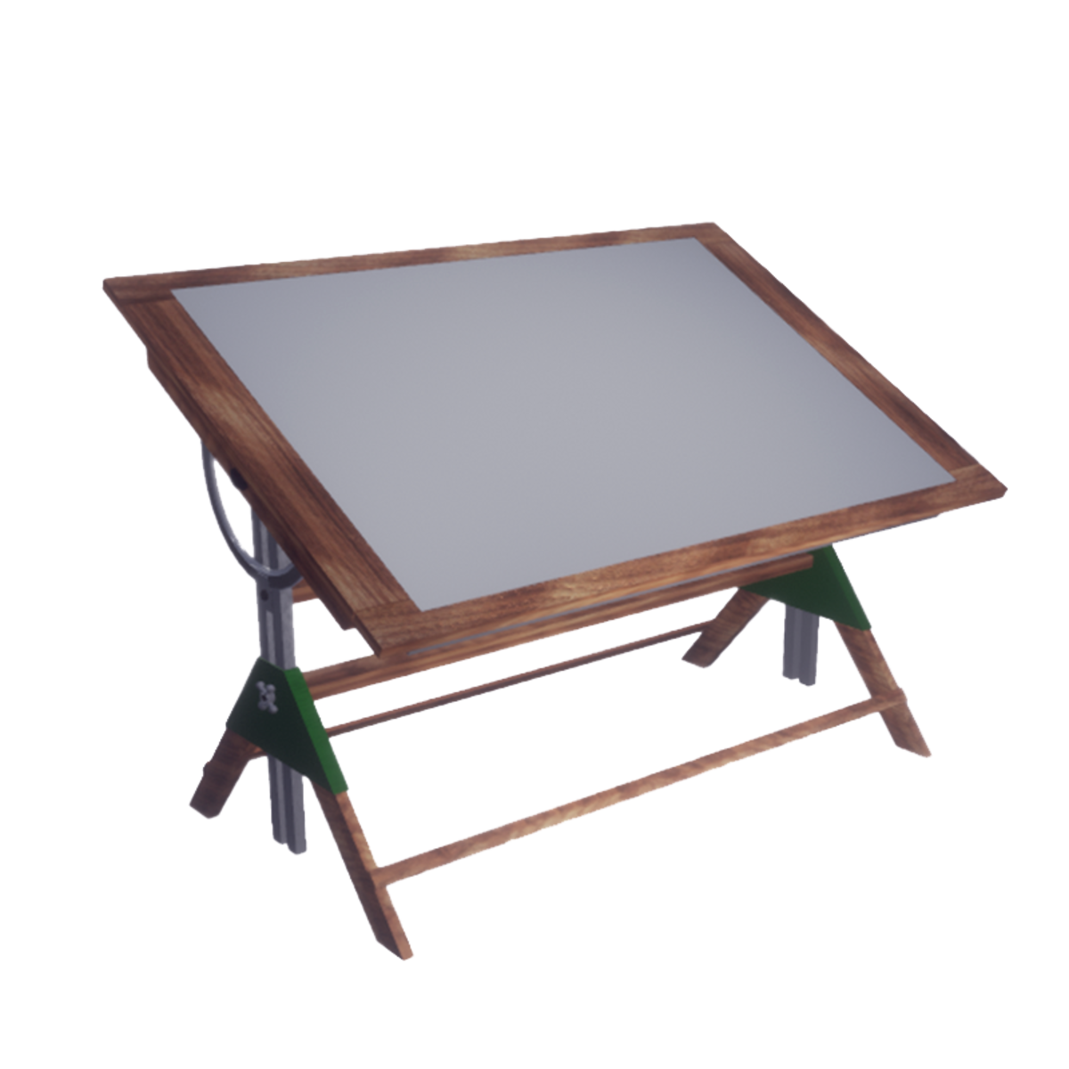 Antique drafting table with Walnut wood frame, grey metal and green metal finish. Glass in center with slight reflection and 40% grey Diffusion. Item is physical.