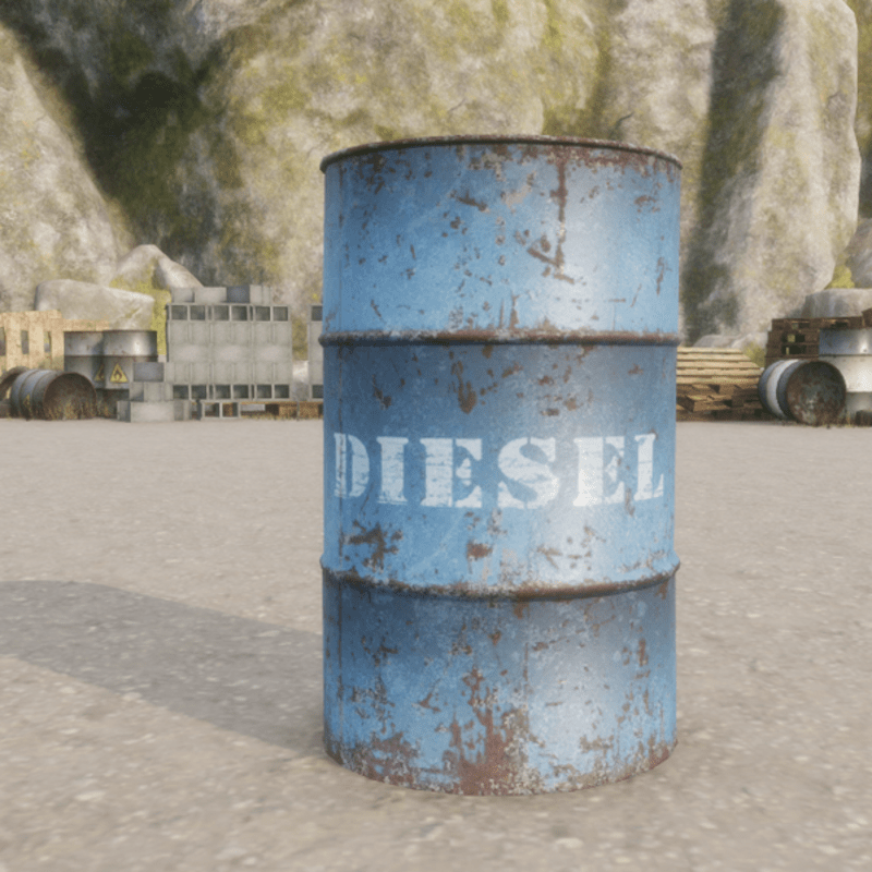 Rusty Blue Weathered Oil Drum with the word 'Diesel' written on the side. Low poly FBX model with collision mesh and 1K PBR texturing.