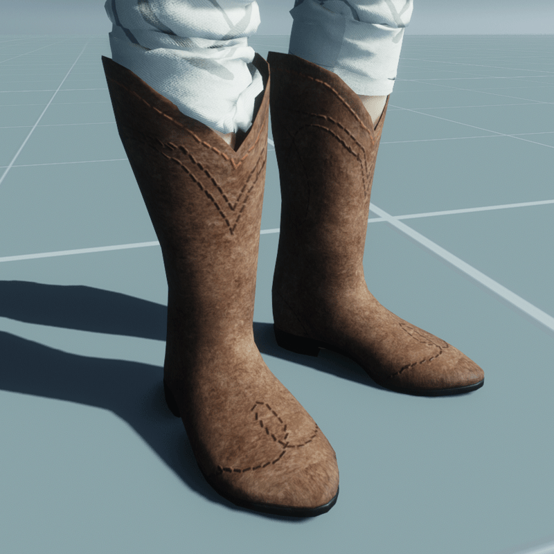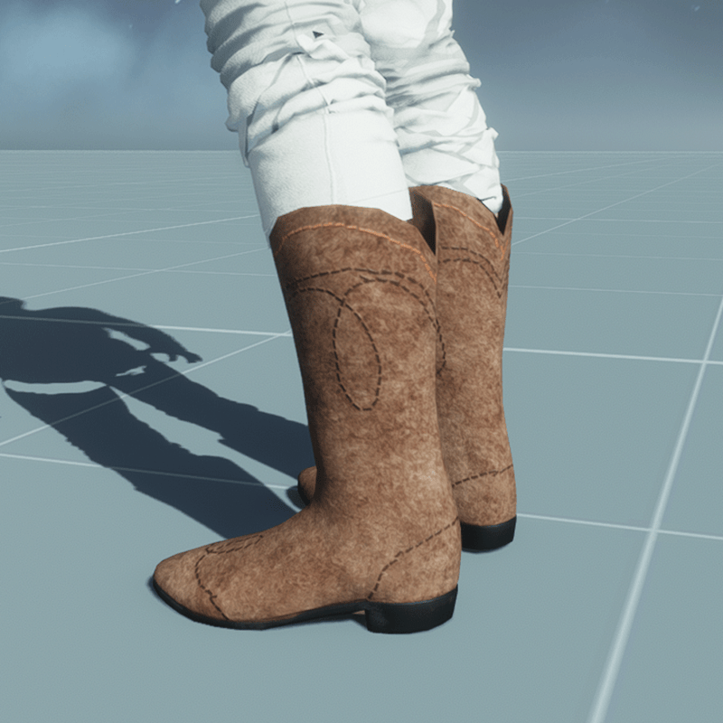Suede leather cowboy boots. With sewing patterns in different colors. Classic a bit rustic look. And one more thing, cowboy: Pull up yer pants to yer knees (if you are wearing any) if you want these boots sit right. You can do that in "Adjust Clothing" with a mouse. Ride safe, cowboy!