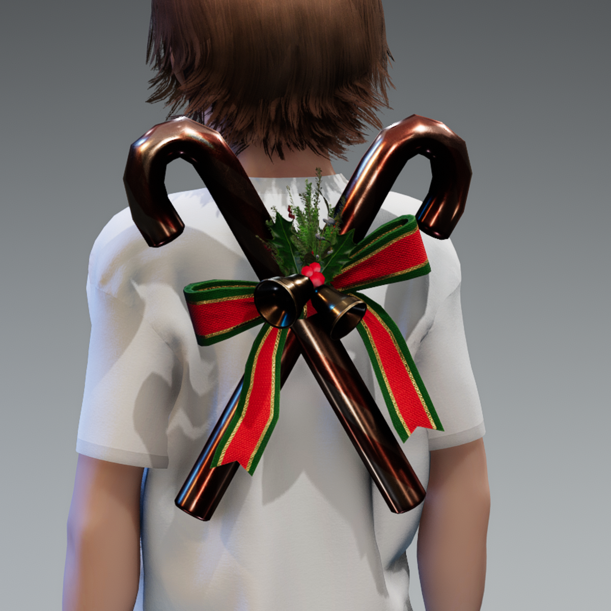 A simple cross of candy canes with holly and bells for festive back bling.
