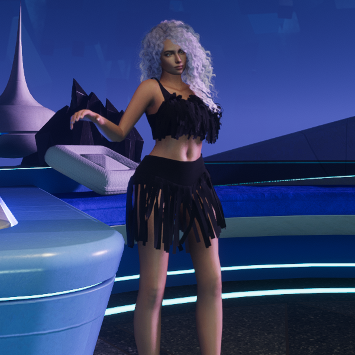 Black fringe top made to match fringed shorts found here: https://store.sansar.com/listings/54b2f233-f2de-4fb1-811a-2c3489cfba0c/flapper-fringe-shorts-black Made in Marvelous Designer so you can adjust to your needs. Tested on Alina Avatar by Cora.