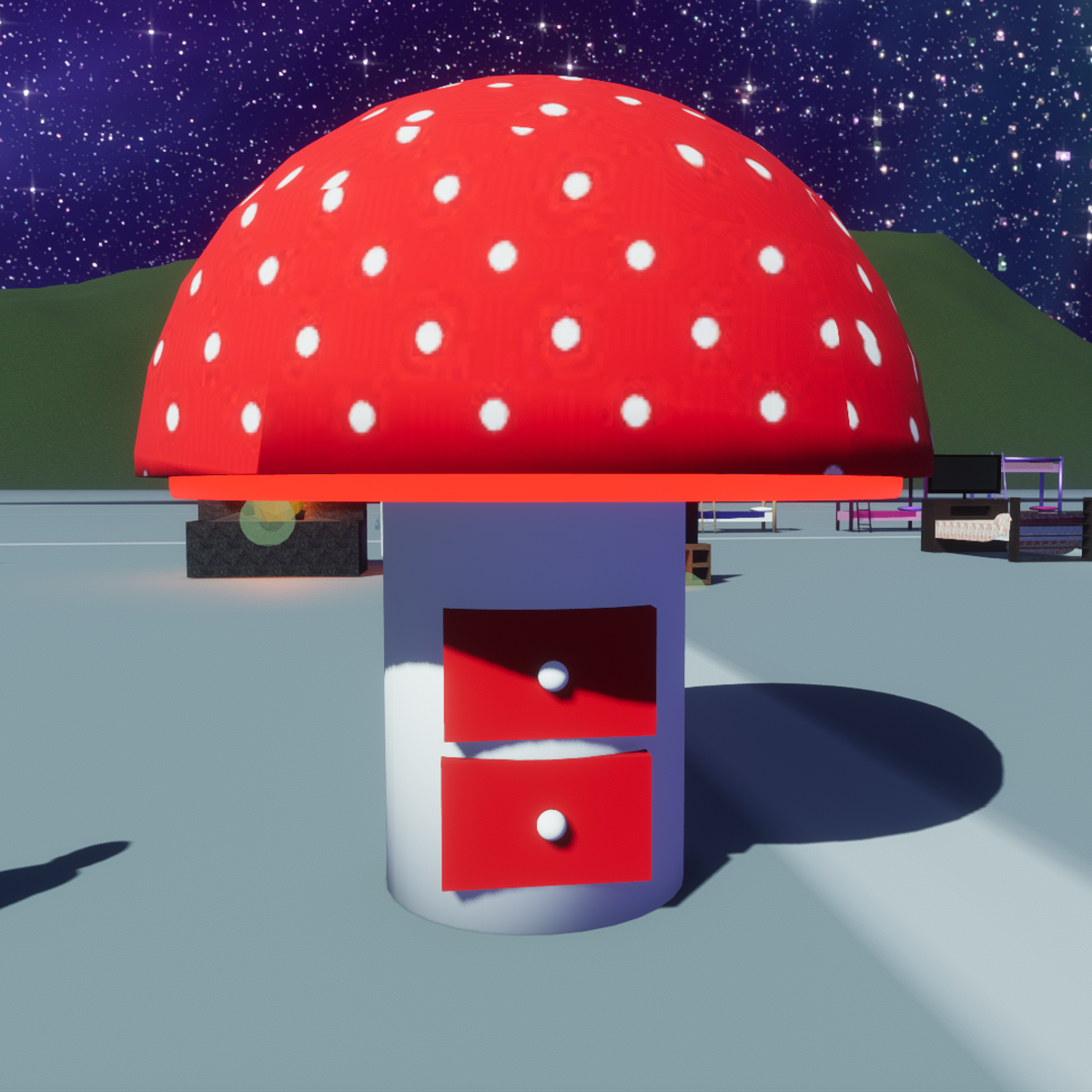 A unique piece of furniture. A place to store your clothes and also a light, a circle underneath the head of the mushroom illuminates so you can find your dresser in darkness.