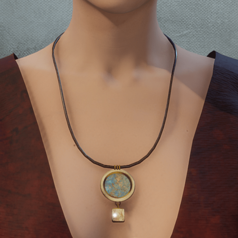 Earth Magic Necklace in brass for FEMALE. Stone, leather and metals come together. This fits close to the body next to skin so will not work "over" sweaters etc. An accessory that will appear in the lookbook necklace section.