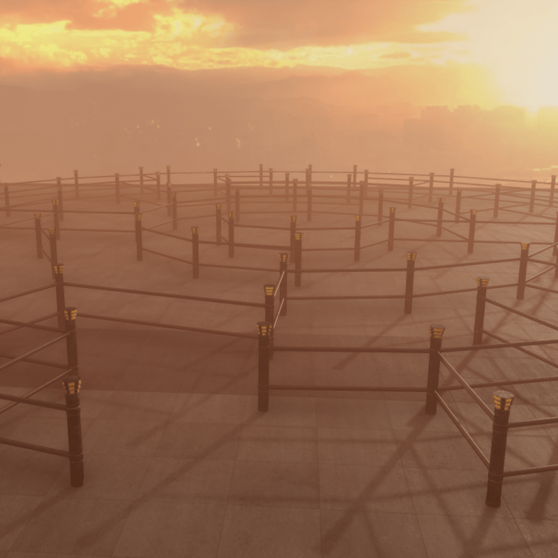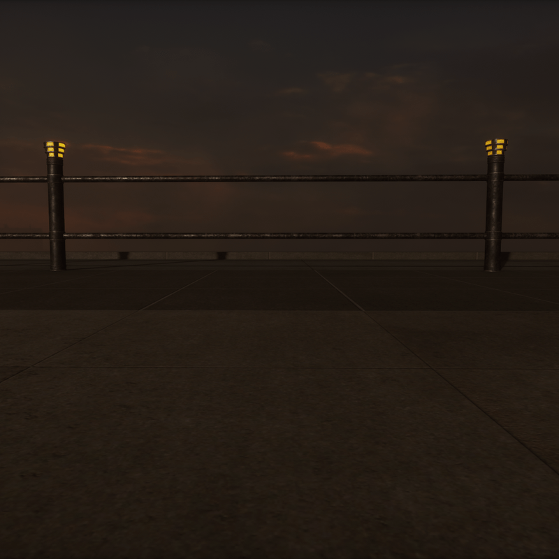 Metal railing in an weathered Art Deco style. Combined with the Deco Railing Post (purchased separately), you can design a run rotating to any angle. Texturing consists of two 1024 and one 512 texture (the emissive light)