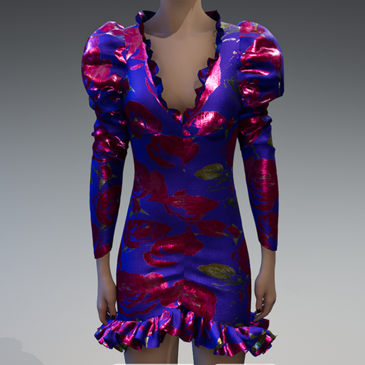 Roses metallic violet brocade ruched puff sleeve top