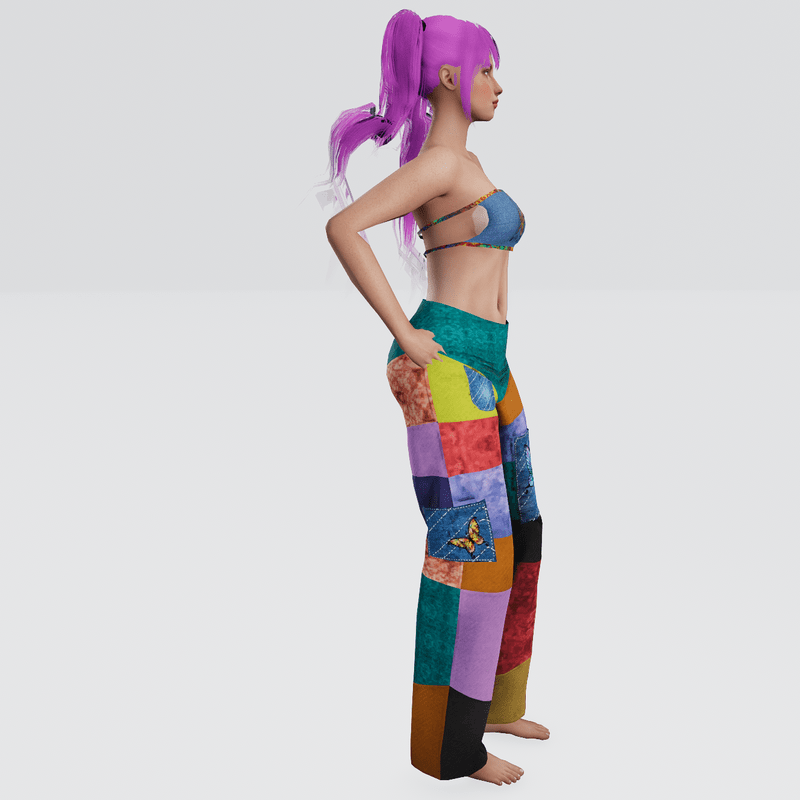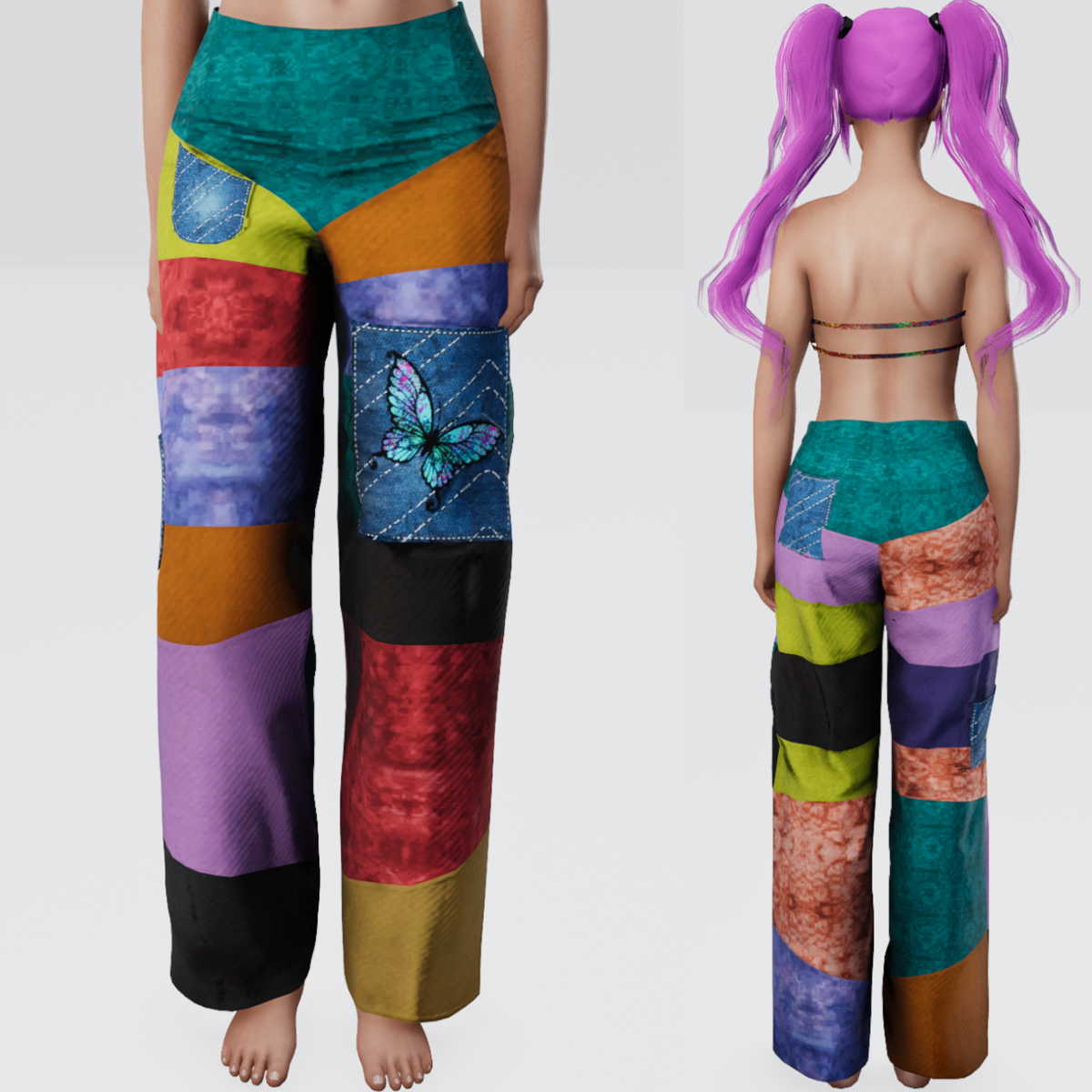 Patchwork Butterfly Corduroy Pants. Get ready for the next music festival with these patchwork pants. They come in three styles. Check out my store for more Hippie Boho fashions, including the Butterfly top you see pictured here. Get Demo Here: https://store.sansar.com/listings/53d7c658-0f63-4468-ae87-a539be369755/patchwork-butterfly-corduroy-pants---demo Trying on the available Demo is the best way to assure your satisfaction with quality and fit. The lighting isn't the best in the lookbook and the shoulders seem to fit funny in the lookbook as well, so I recommend wearing the demo in world to see how it truly looks on you. Visit my inworld store experience to find discounted items that or not available on the marketplace. https://atlas.sansar.com/experiences/lonaleelancaster/lona Made in Marvelous Designer and can be adjusted to fit most avatars. Please try a demo to assure fit and satisfaction. To learn more about transforming and adjusting Marvelous Designer clothing visit this link: https://help.sansar.com/hc/en-us/articles/115005693363-Fitting-Marvelous-Designer-clothing-to-your-avatar#some-tips