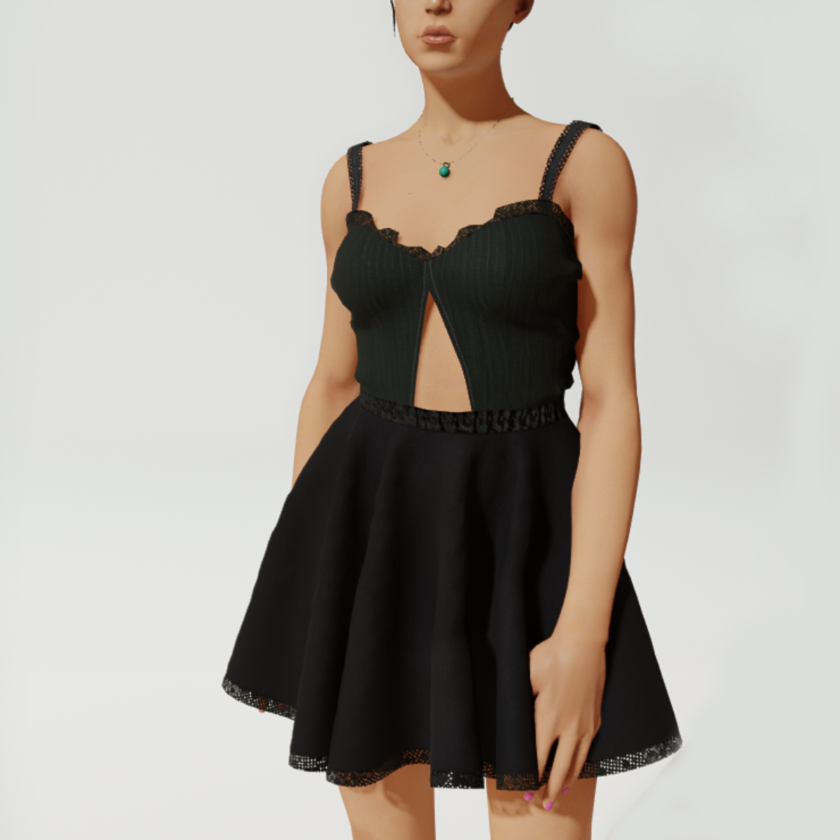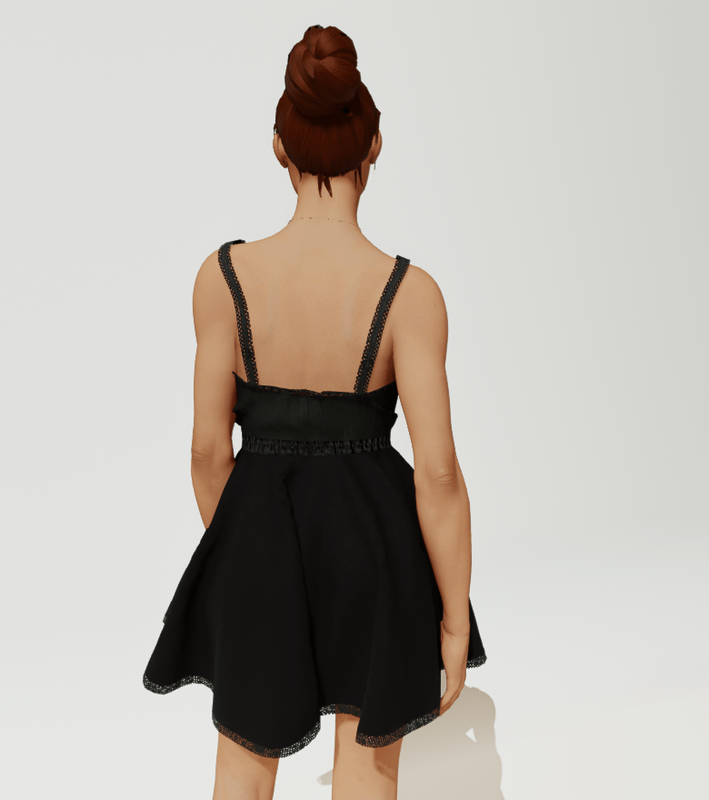 Pretty lace edged dress in black, with flouncy skirt.