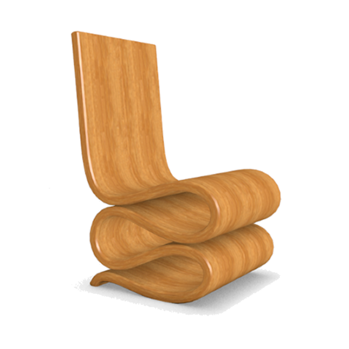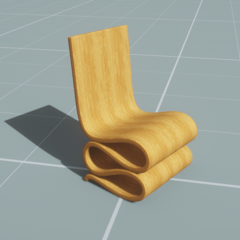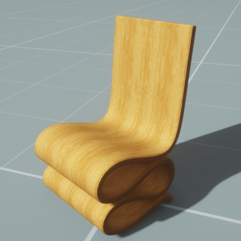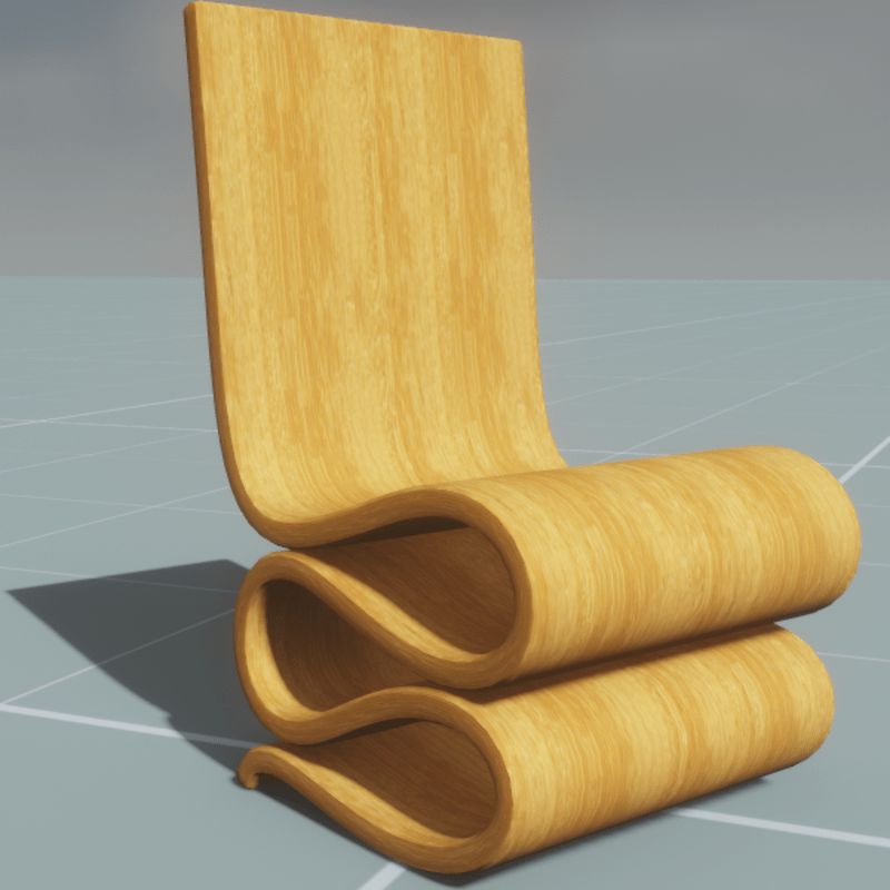 A modern style polished wooden wiggle chair in the style of Frank Gehry. (Google wiggle chair). With collision.