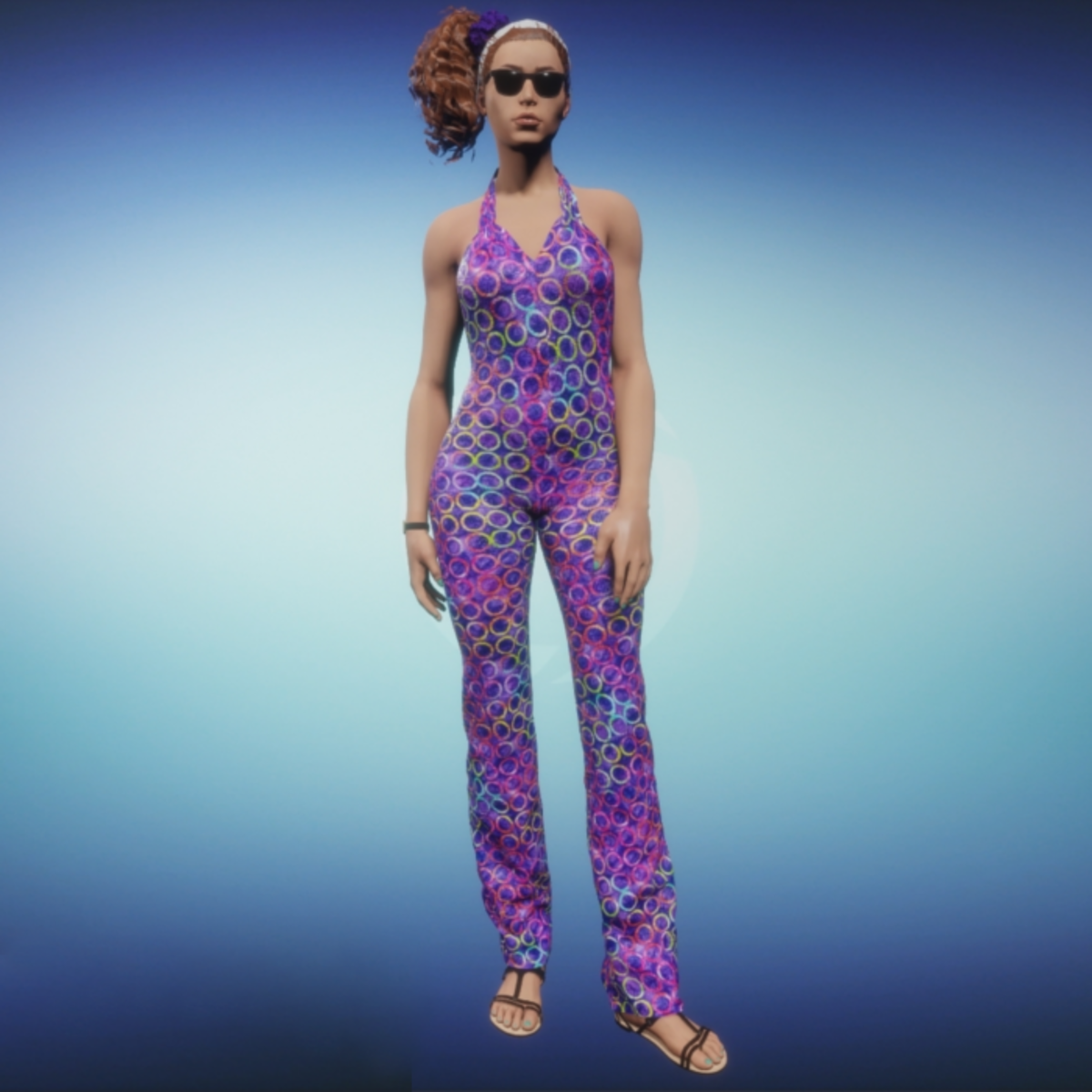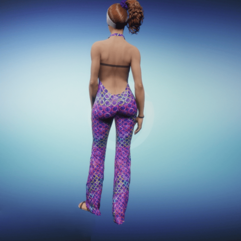 One piece jumpsuit with low back and v-sculpted neckline with flared legs. The Journey One Button Cardigan is color coordinated to pair with the jumpsuit for those wishing to cover up the back and arms. ***Please note that the default bra straps do show while wearing this garment. Hopefully, the Sansar team will make adjustments and remove the straps sooner rather than later.