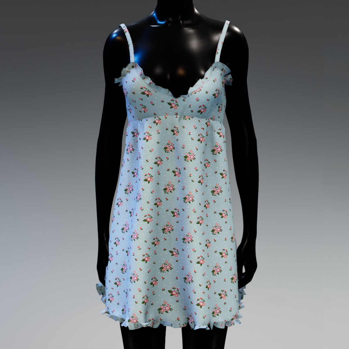 A cute, short nightwear with straps, ruffles in blue colour and small printed flowers.