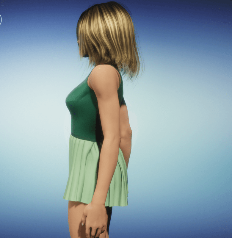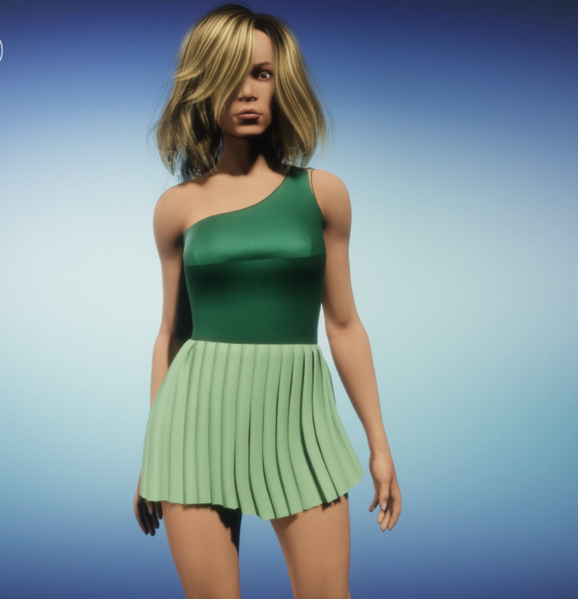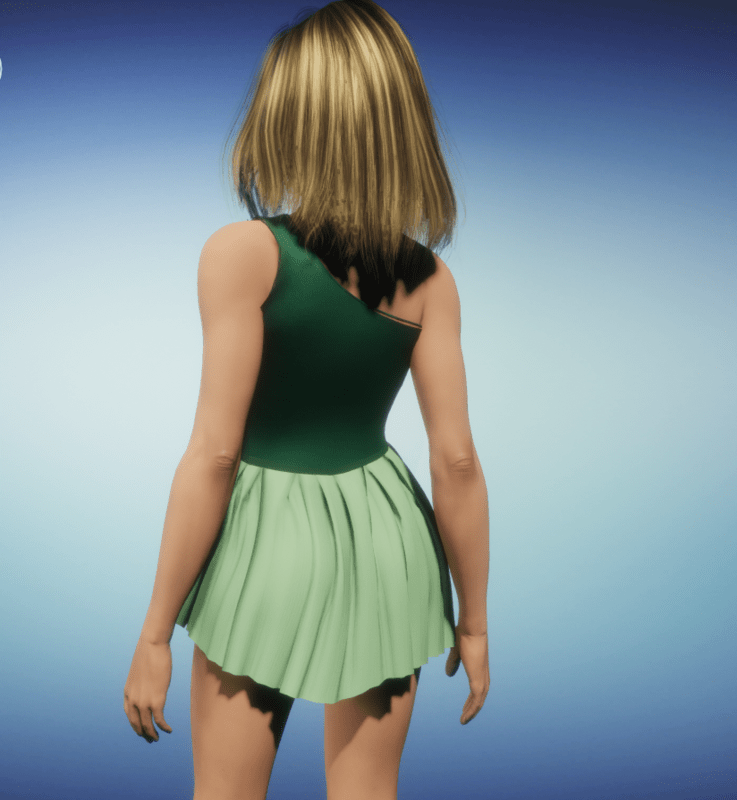 A cute dancing outfit, featuring an asymmetrical shoulder, fitted bodice and a multi box-pleated miniskirt. In leaf green and pistachio green.