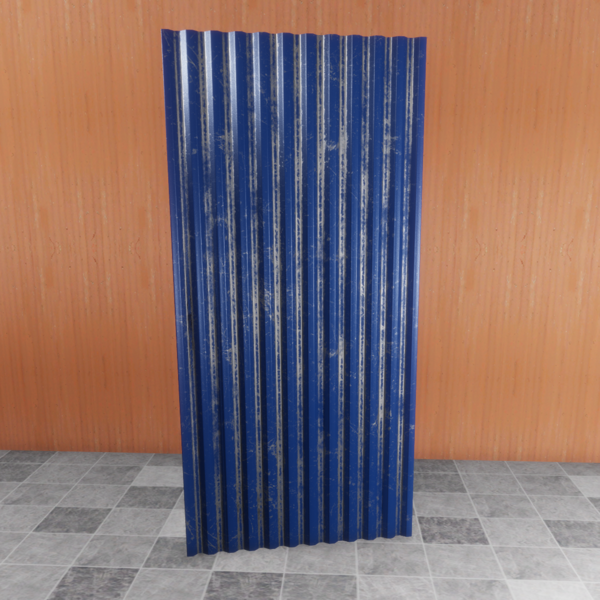 A sheet of worn down, blue painted corrugated metal. No physics. PBR textures.