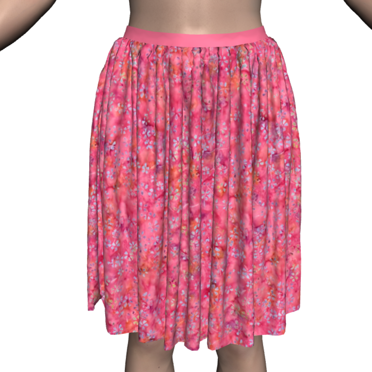 Dynamic knee-length skirt with pink floral batik fabric texture. Created in Marvelous Designer.
