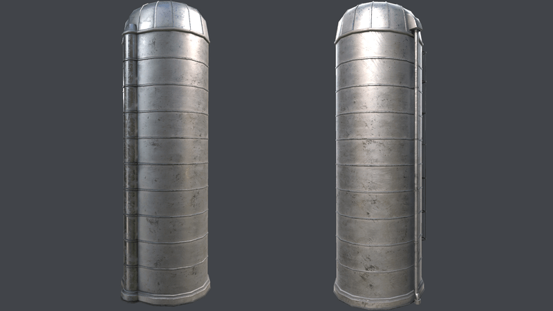 Very Detailed Huge Old Rusty Silo with High-Quality Rusty Steel / Metal PBR Texturing Fits perfect for any PBR game as Exterior Decoration in landscapes, or as a landmark. The Silo has great details to it, such as old rusty Metal Stairs, to a latch in the top, and a long pipe connected from the bottom and up.