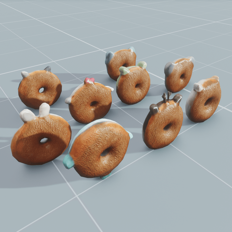 Nine animal donuts, each with their own collision, set to dynamic.