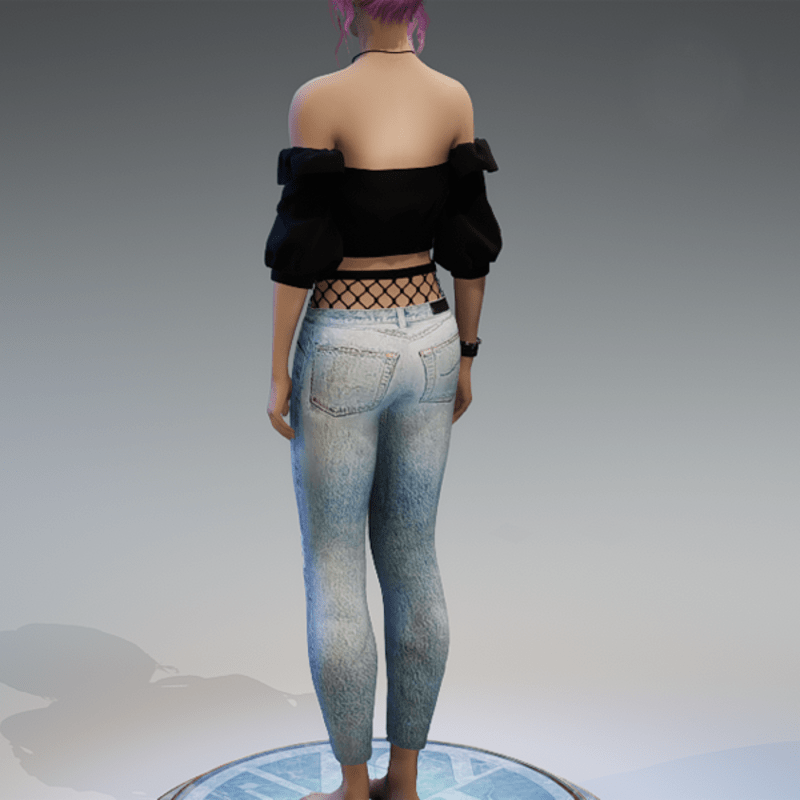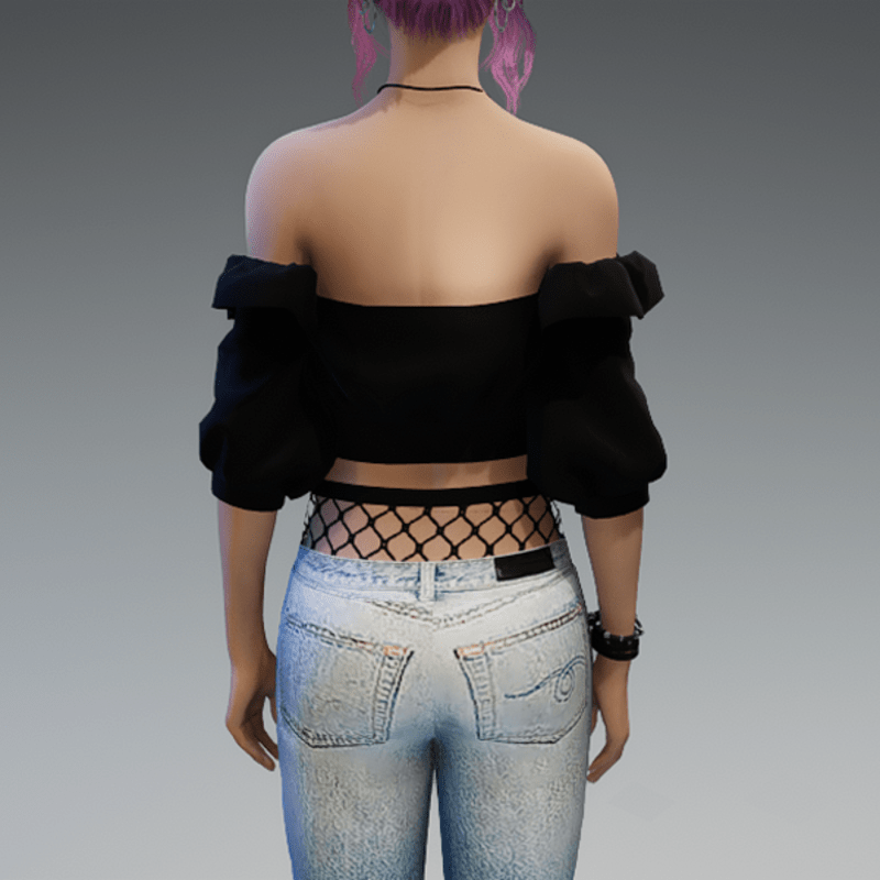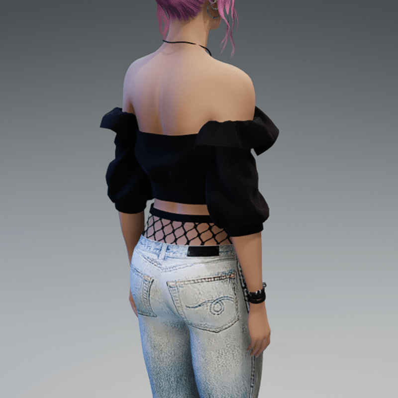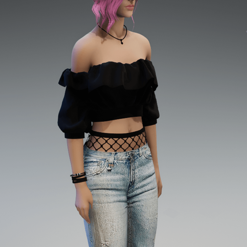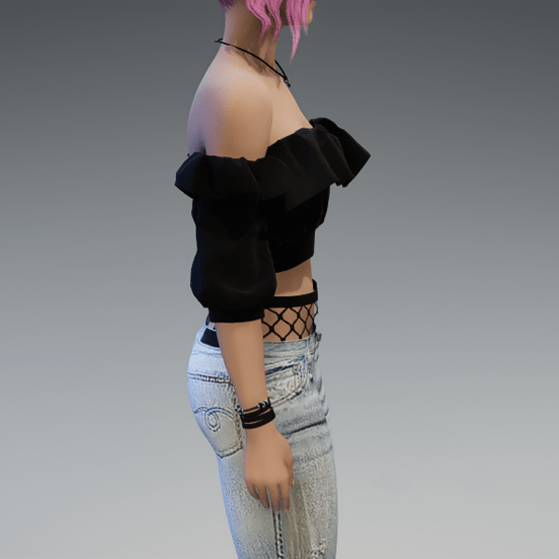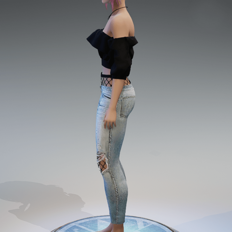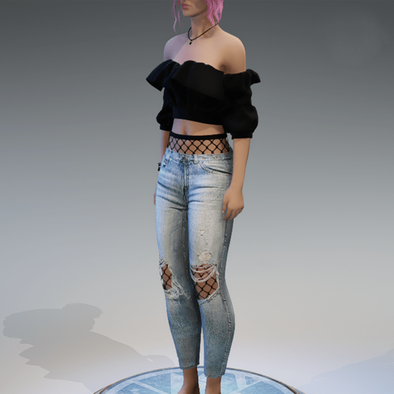 A full outfit, including the denim pants with some fishnet-applications on the knees and the top of the pants, as well as the 'flutter' shoulderfree top in black! If you're not sure about how this outfit will look like on your avatar, please use my free 'siggys store' version first before buying this one! Enjoy!