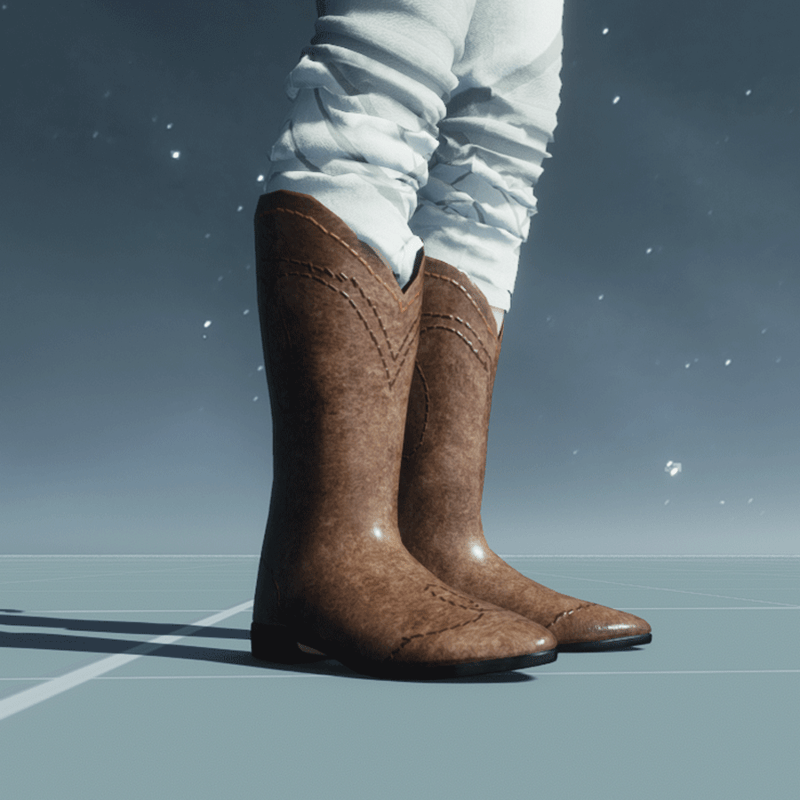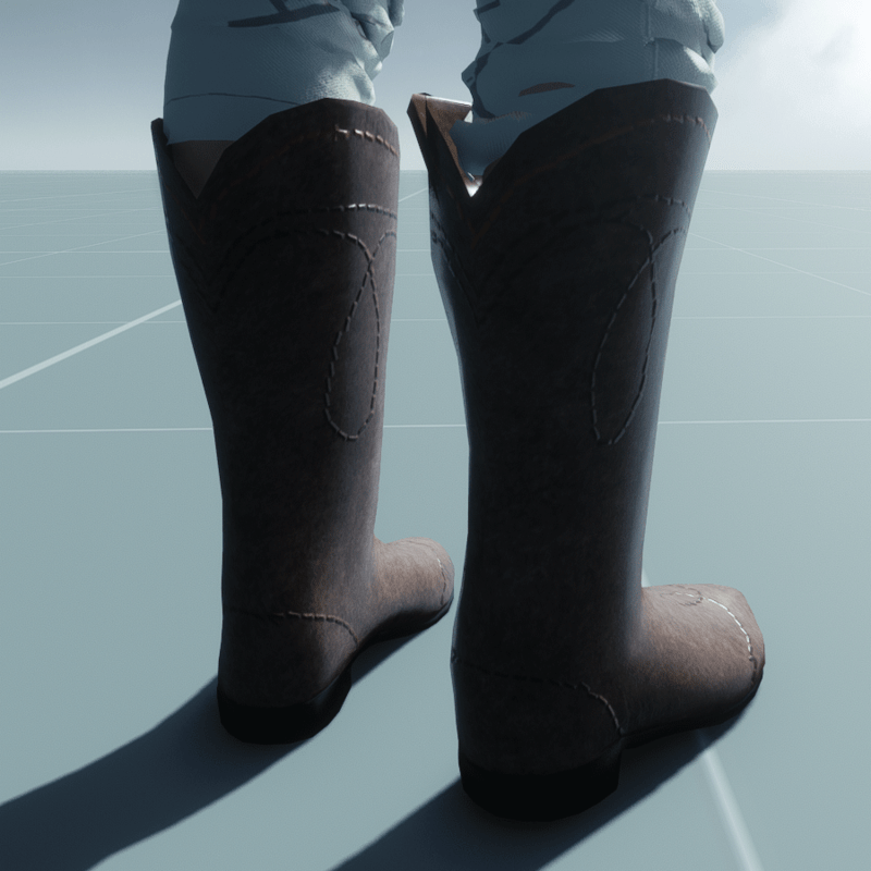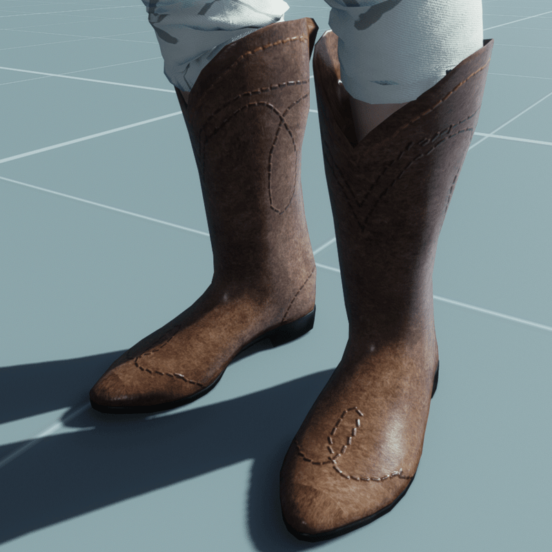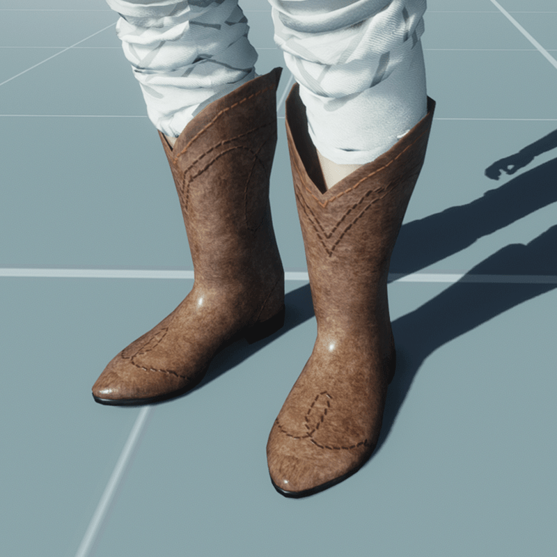 Polished leather cowboy boots. With sewing patterns in different colors. Classic a bit rustic look. And one more thing, cowboy: Pull up yer pants to yer knees (if you are wearing any) if you want these boots sit right. You can do that in "Adjust Clothing" with a mouse. Ride safe, cowboy!