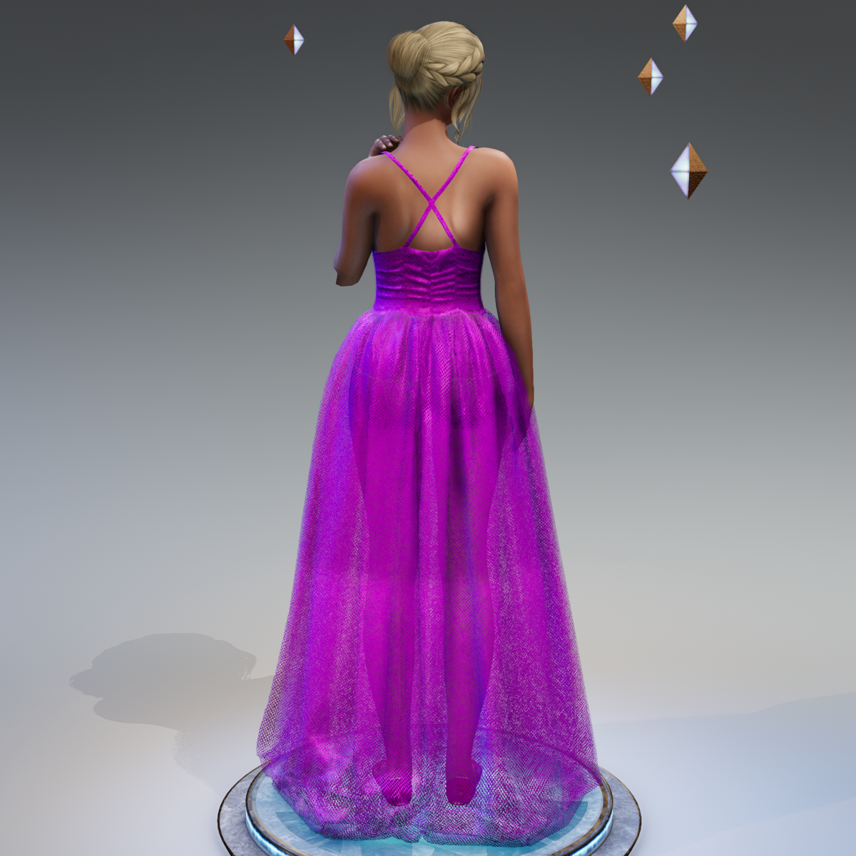 With this silk and tulle dress you will be the belle of the ball! Easy to fit, adjusted to most female human bodies so you will only have to simulate it. But be aware, your simulation takes a while because the design has so much fabric.