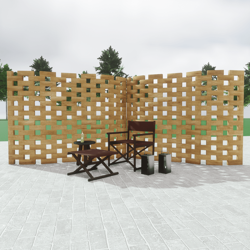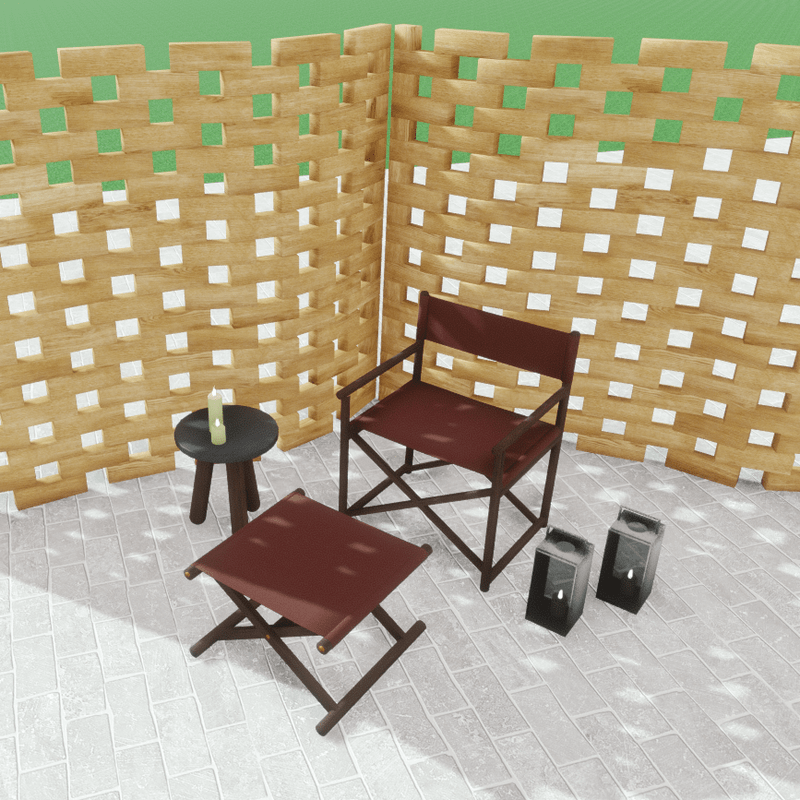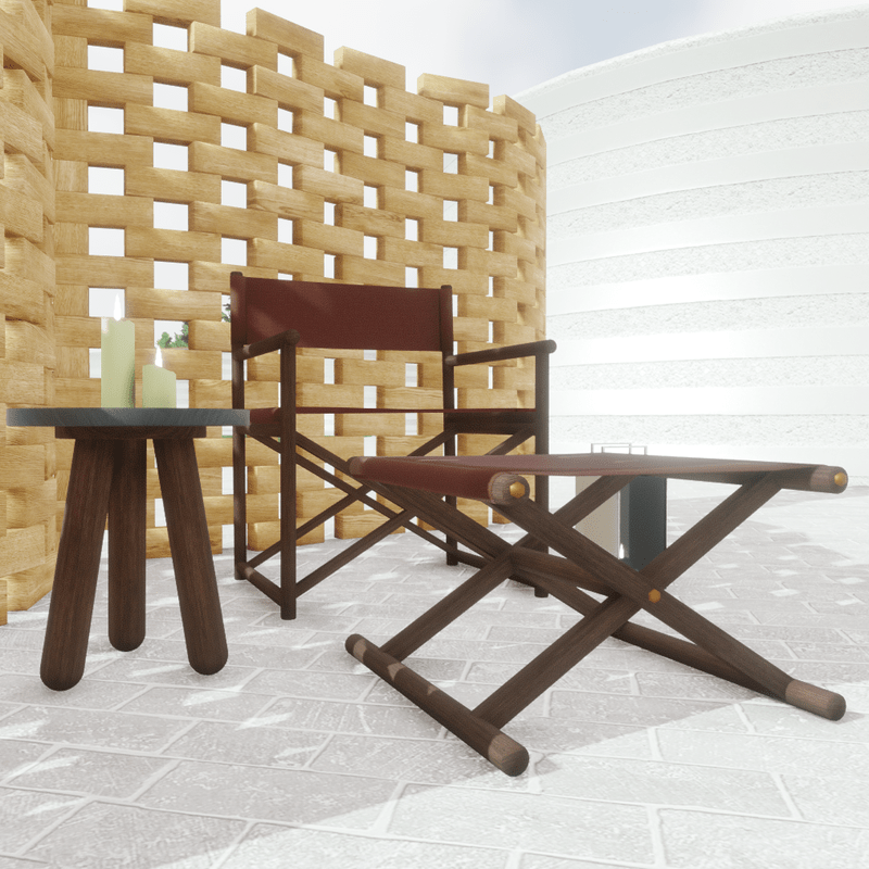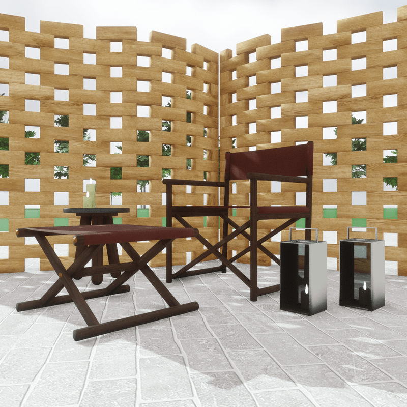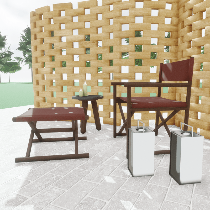 A simple, beach - garden furniture set that includes: - An armchair made of wood and fabric. With collision. - A matching puff. With collision. - A tripod wooden side table. With collision. - A wooden space divider. With collision. - A lantern made of glass and metal. - Two candles, a small and a taller one. All items editable except the candle materials. You can take a closer look here: https://atlas.sansar.com/experiences/luise/studio-lamda