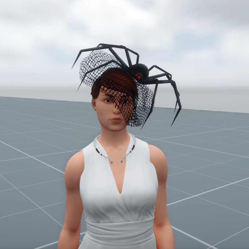 A unique designer's hat, beautiful and stylish, for women. It has a rich black net veil that covers part of the face and half the head, at an angle. Comes with special lighting effects, the spider eyes open and blink at times with an intense red glow light.