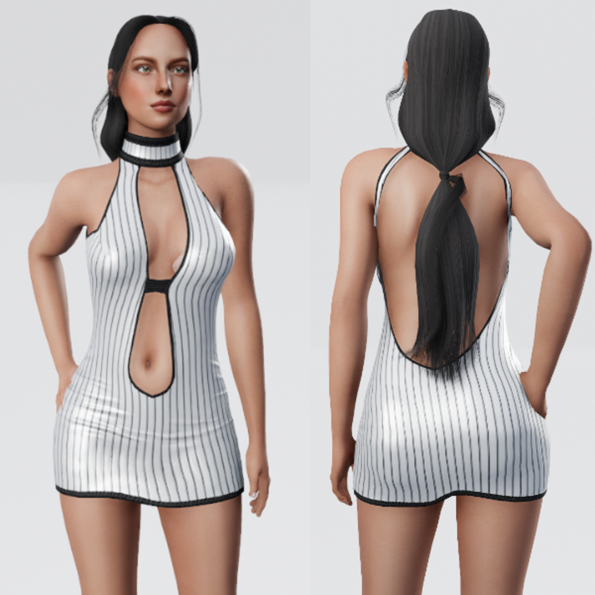 Pinstriped Dress with Keyhole front and choker collar. This dress has a wild west brothel feel with even less fabric. Get Demo Here: https://store.sansar.com/listings/c9d57112-9d54-4d61-9f03-7265cf7b7d7a/pin-stripped-keyhole-dress---demo Trying on the available Demo is the best way to assure your satisfaction with quality and fit. The lighting isn't the best in the lookbook and the shoulders seem to fit funny in the lookbook as well, so I recommend wearing the demo in world to see how it truly looks on you. Visit my inworld store experience to find discounted items that or not available on the marketplace and also look for miniature butterflies to find free mystery gifts! https://atlas.sansar.com/experiences/lonaleelancaster/lona Made in Marvelous Designer and can be adjusted to fit most avatars. Please try a demo to assure fit and satisfaction. To learn more about transforming and adjusting Marvelous Designer clothing visit this link: https://help.sansar.com/hc/en-us/articles/115005693363-Fitting-Marvelous-Designer-clothing-to-your-avatar#some-tips