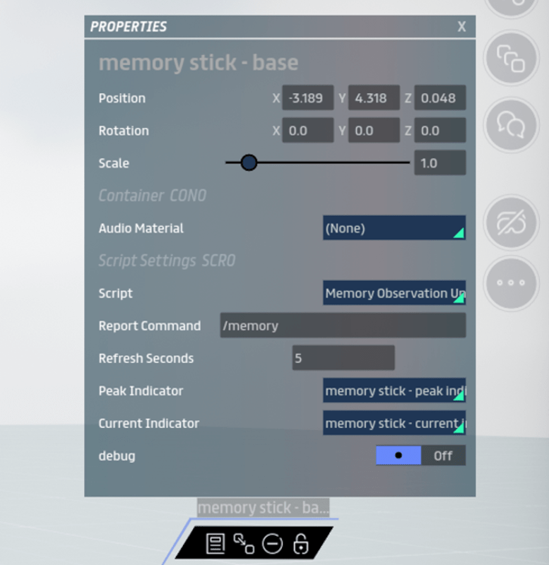 Some assembly required! for use with the following (free) items, also in my store: Memory Observation Unit - Script memory stick - current indicator memory stick - peak indicator To assemble: Once you have all 4 pieces in your inventory: 1. rez the "memory stick - base" in your experience. 2. drop the "Memory Observation Unit" script into it. 3. set the script parameters. I recommend the following: Report Command: /memory Refresh Seconds: 5 debug: off (leaving this on will provide useful chat spam) Peak Indicator: select "memory stick - peak indicator" Current Indicator: select "memory stick - current indicator" The last 2 are important! Once this is set up, visit your experience and watch the memory observation unit. The "Current Indicator" represents the current memory usage, and the "Peak Indicator" represents the peak memory usage since the last scene reset. You can type /memory into chat at any time to get the current memory usage.