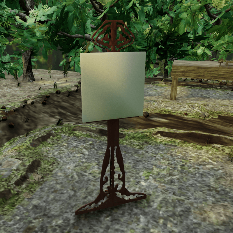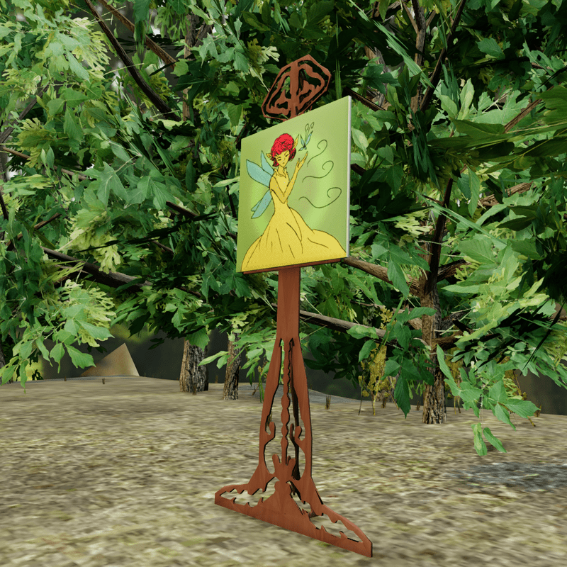 A hand carved Easel with a Canvas to display your Art on. Just edit the Albedo image on the Canvas Material to have your image displayed and get the "canvas" effect applied via Normal/Rough maps. ~~Can be seen in Fundee Design Experience~~ https://atlas.sansar.com/experiences/darkfyrealgoma/fundee-designs