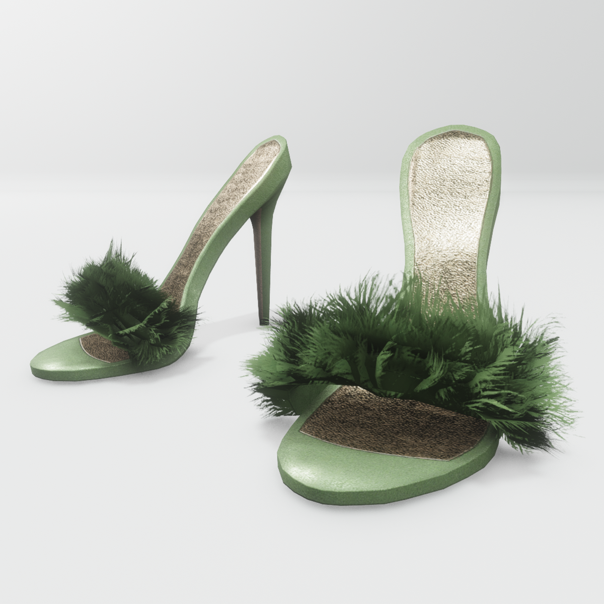 High heeled slippers for avatar Nicci. Stiletto heels, leather material and long decorative fur in green colour. Get the free demo before purchasing here: https://store.sansar.com/listings/e1107515-f91c-4ab0-95d5-0da9c575bbd2/niccis-fur-slippers----demo