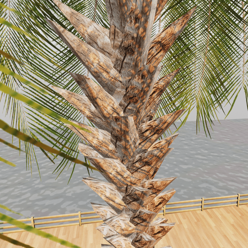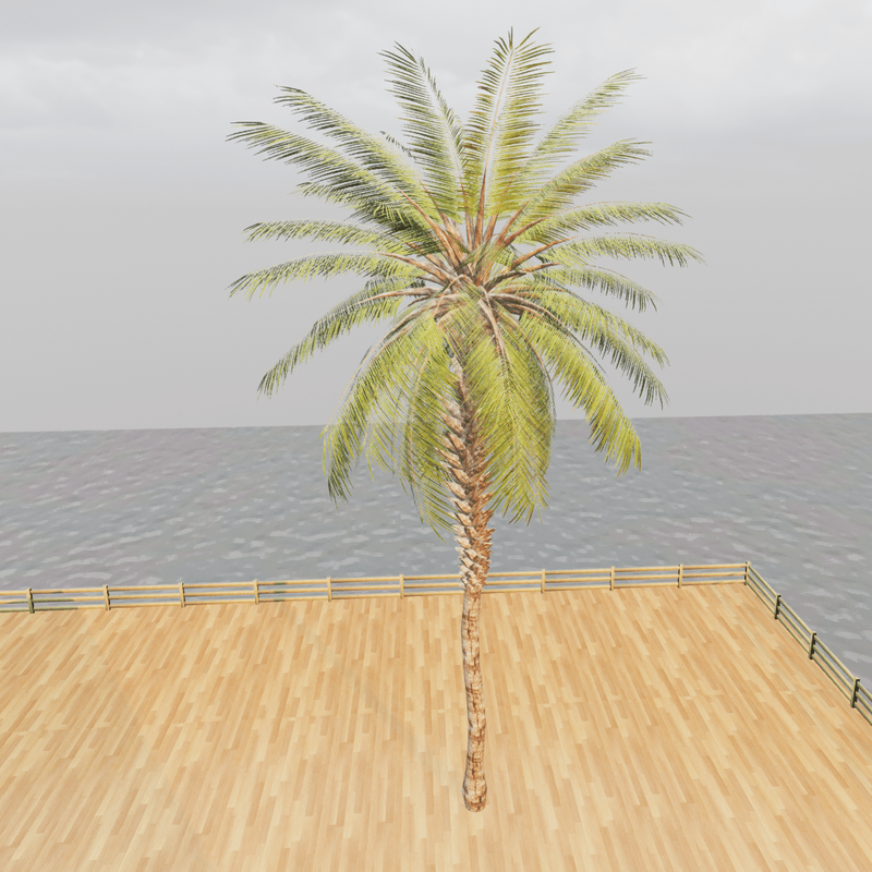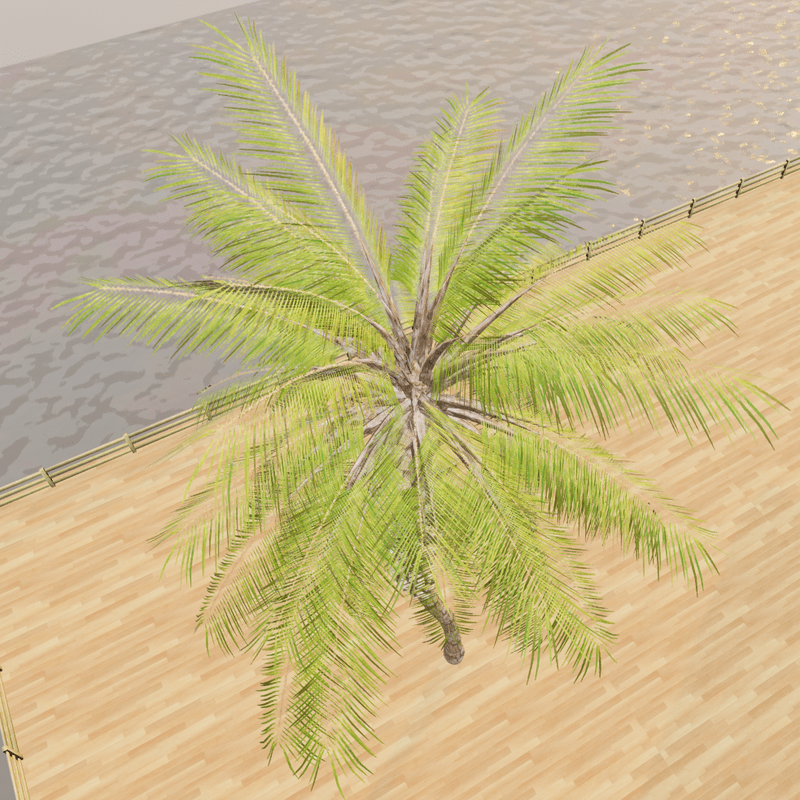 A beautiful tropical palm tree. As a centrepiece item, this will be ideal for a beach environment or perhaps as a town / village installation. It's fairly low poly for a tree, so you can scatter a few about without too much impact on your experience. - 5984 Tris - Diffuse, normal, roughness maps (all 512 x 512) for tree trunk. - Diffuse + alpha, normal + alpha, roughness maps (all 320 x 1024) for the leaves. - Set to a reasonable height by default for a mature palm tree, can be rescaled easily. - No collision - easy to add collision if you want to. View the item in-world at: https://atlas.sansar.com/experiences/fiddybux-2071/fiddyland-base