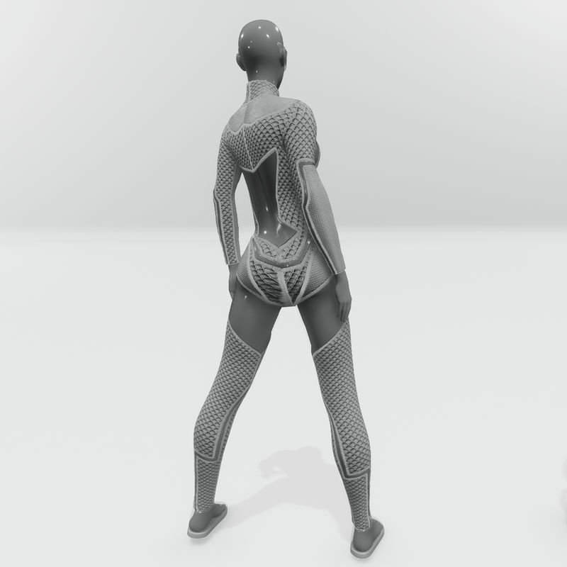 Futuristic female jumpsuit, with large, plastic like, high transparent areas. It has long sleeves and mock turtleneck. White color. Get the free demo item to check fit and style before purchasing here: https://store.sansar.com/listings/89a0defa-80b5-4282-a3d5-f5d807904673/baryt-jumpsuit---demo