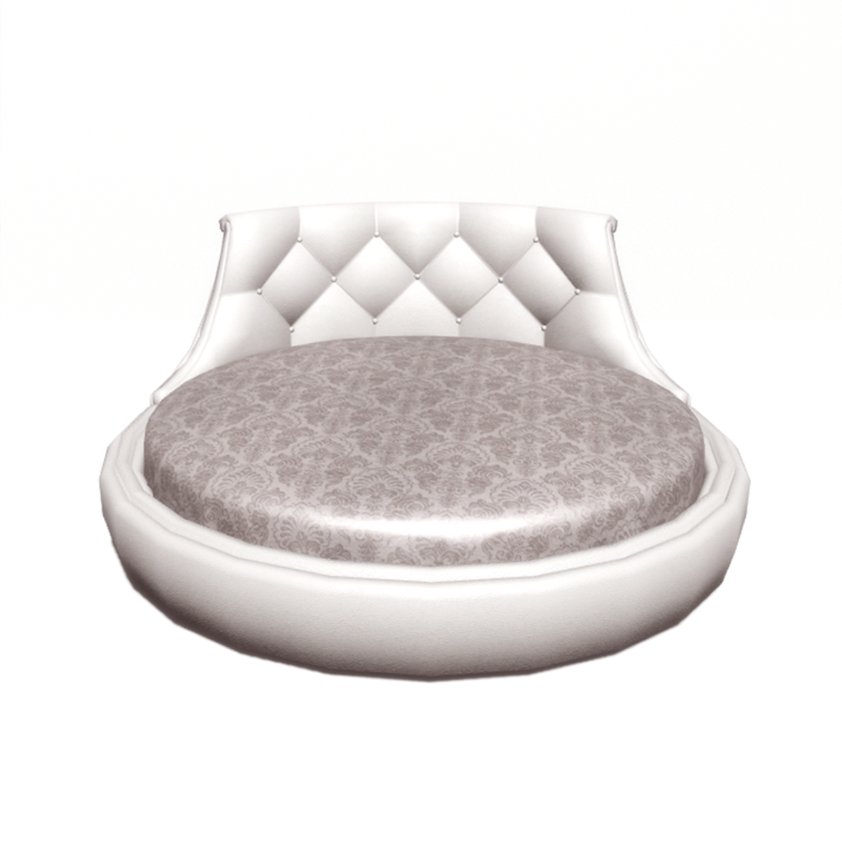 A white leather round bed, in romantic style. The bed cover has a Vistorian style pattern. With collision. Take a closer look here: https://atlas.sansar.com/experiences/luise/studio-lamda