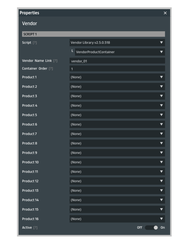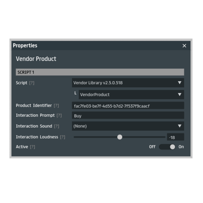 The Vendor Library consists of 4 scripts to create all sorts of vendors and product displays, completely customizable to your needs. __________________________________________________________________________________________ https://gyazo.com/ae25c8161dbe9e1ac6a8ae23f85d57f2 https://gyazo.com/2f6be3a812d68fb9ba86aae846e472df You can go and try out some of the example setups here: https://atlas.sansar.com/experiences/tron-sansar/vendor-system-examples You can grab a free vendor example to inspect the scripts usage in the editor here: https://store.sansar.com/listings/d0d90f30-b13b-4de3-9c88-95abed430483/snows-avatar-vendor * Instructions * ? Creating a product display ? - Add a Vendor script to the object you want as the vendor base. - Add a VendorProductContainer script to the object. - Make sure the Vendor Name Link setting in the VendorProductContainer matches the Vendor Name setting in the Vendor script so they get linked. - Add some products from inventory to the VendorProductContainer. - Turn on 'Automated Scrolling' in the Vendor script settings and set the 'Automated Scrolling Delay' to 0 seconds. After you build, the vendor should now immediately start displaying all the products in sequence with the default 1O seconds interval. NOTE: In case something is not working as intended, press Ctrl-D to open the console in your experience and check the logs for any warnings or error messages. If the problem persists or you need help setting things up, don't hesitate to contact @Tronn. ? Adding interactive behaviour to the products ? - Rez the object that represents the product in your scene and add a VendorProduct script - Set the unique identifier of the store listing. This alphanumeric value can be found in the store listing url and is 32 characters long. - Optional: set the interaction prompt, this text will appear when hovering the product. - Optional: set the interaction sound by selecting a sound from your inventory. - Save the object back to inventory. - Select the scripted object as a product in a VendorProductContainer. When the product is spawned, you can now click it to open the corresponding store listing. Additionally, you can add other scripts to your products to create a more dynamic and interesting display, for example a spinning motion that shows the product from all angles over time. (https://store.sansar.com/listings/7446e1a9-de41-4a66-acaf-bdd5f32607ab/object-spinner) ? Adding button controls to the vendor ? Linking buttons to your vendor will enable remote control of the Vendor at runtime. By sending commands to the Vendor, you can instruct it to do certain actions like navigating products, open a store listing or changing the display mode. - Create an object in your scene that you want to use as a button and add the VendorButton script to it. - Set the Vendor Name Link property to the vendor name you want to connect. - Set the Interaction Command value to 'nextproduct' (without the single quotes). This can be any one of the 18 different available commands, more info about each of these can be found below in the Script Settings info section. - Optional: set the interaction prompt, this text will appear when hovering the button. - Optional: set the interaction sound by selecting a sound from your inventory. - Optional: restrict the usage of the button by setting the accessibility properties. When you click the button in your experience, the vendor should navigate to the next product. ? Adding a transition indicator ? The transition indicator is displayed when navigating between products, it can go from a simple loading indicator to a complex animated particle effect. - Select the transition indicator object from your inventory via the dropdown menu in the Vendor script properties. - Set the position & rotation offset values so the indicator appears where you want. - Set the pre- and post-transition time values (milliseconds) to determine how long the transition will be seen. The transition time settings are ideal when you want to show a transition that takes longer than the actual product rezzing. Pre-transition time determines how long the transition should show before the actual product starts rezzing, and post-transition time determines how long the transition is shown after the product has rezzed. If you set these both to 0 ms. the transition will be seen only for the amount of time it takes to rez the product. ? Using multiple productcontainers ? - Linking multiple VendorProductContainers to the same Vendor script allows you to have more than 16 products in one Vendor. - This can also be usefull if you want to have multiple products with different variations, so you can group all the variations of a product in one container and have seperate buttons to navigate over the variations by using the containerproduct commands. - Navigating between different container can be done with the container commands. You can visualize this setup like a two dimensional grid that you can navigate, where the containers are the rows and the products in are the columns. ? Script Settings ? * Vendor * Display and distribute products. - Vendor Name: the identifying name of the vendor that is used to link buttons and product containers. - Product Position Offset: the relative position offset from the vendor, determines where products will spawn. - Product Rotation Offset: the initial rotation offset in degrees for products. - Align Product Rotation: the Product Rotation Offset is applied relative to the vendor rotation when on or will be absolute in world space when off. - Automated Scrolling: the vendor will start to automatically scroll the products when on. - Automated Scrolling Delay: the amount of time in seconds the vendor has to be idle before starting automated scrolling. - Automated Scrolling Interval: the amount of time in seconds a product is shown during automated scrolling. - Randomize Automated Scrolling: the vendor will show a random product during automated scrolling. - Pr